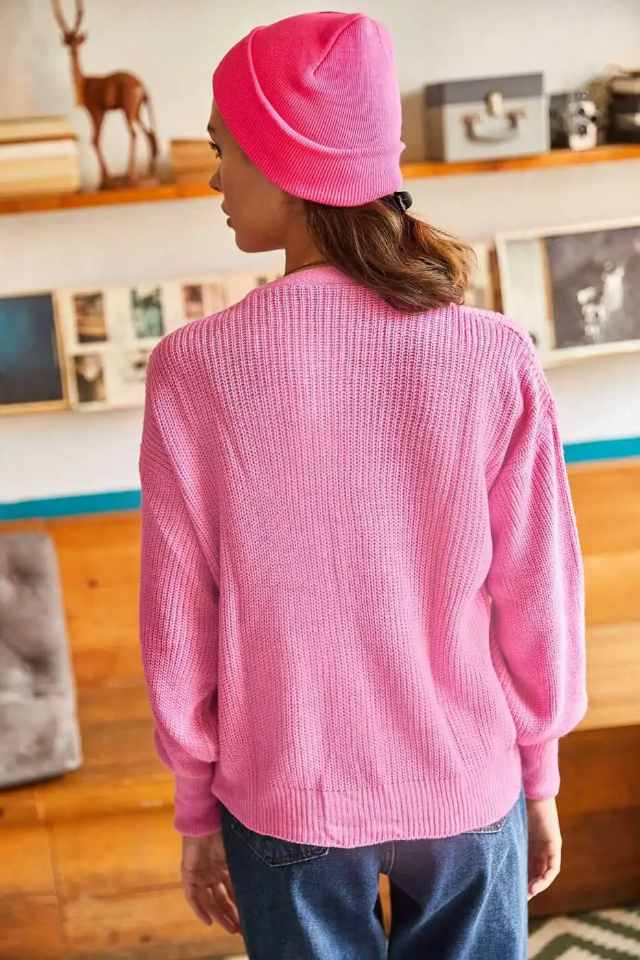 Ushbu shakar pushti tugmali triko kozok bilan o'z uslubingizni yangilang va oqlangan ko'rinish yarating.