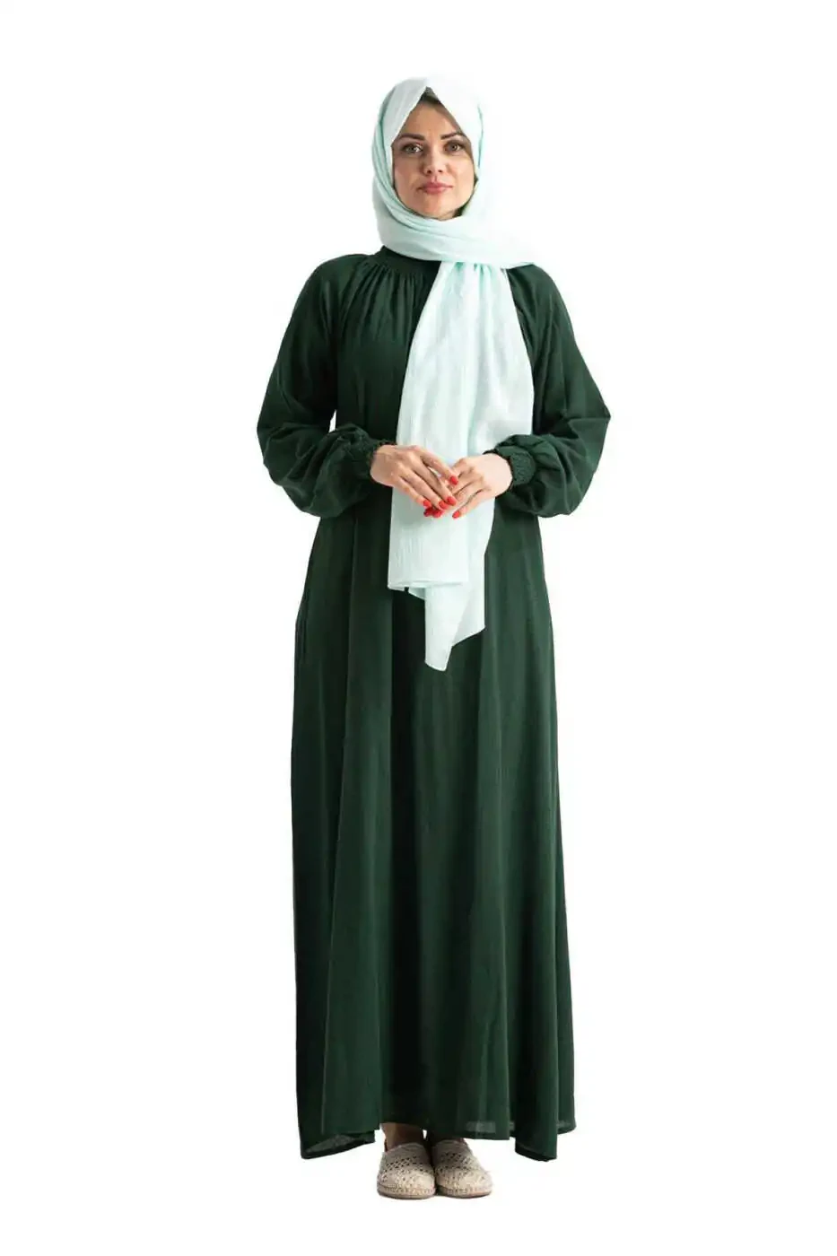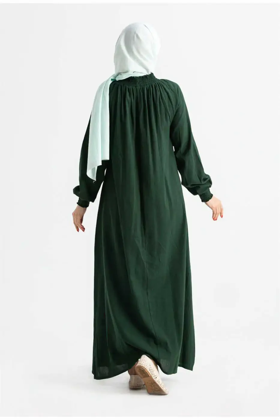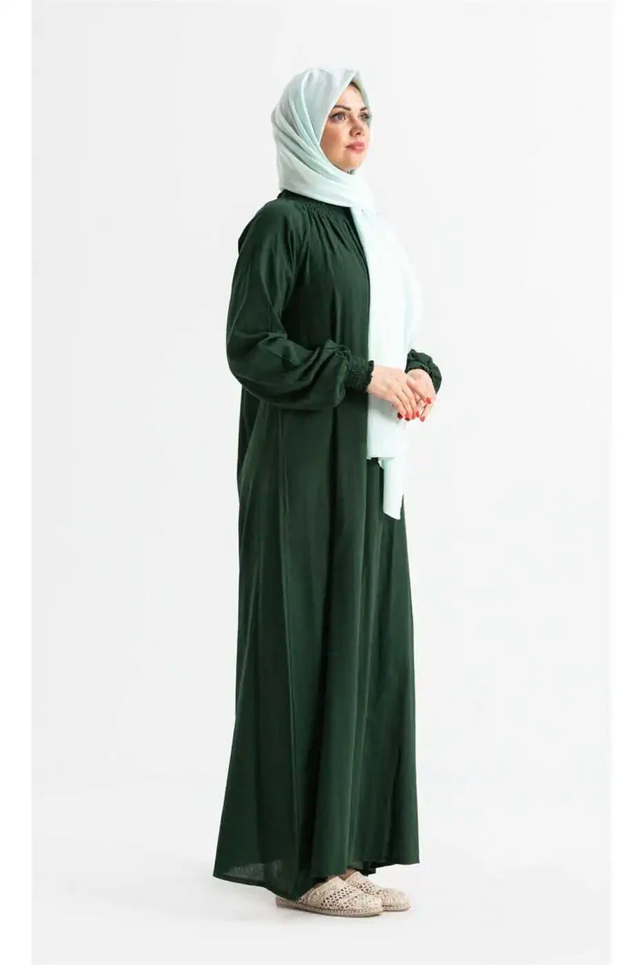 Ayollar uchun Şile to'qimasidan tayyorlangan yashil namoz libosi. Bitta qismli, oson kiyiladi. Yelkalari va yoqasi lastikli. Ys