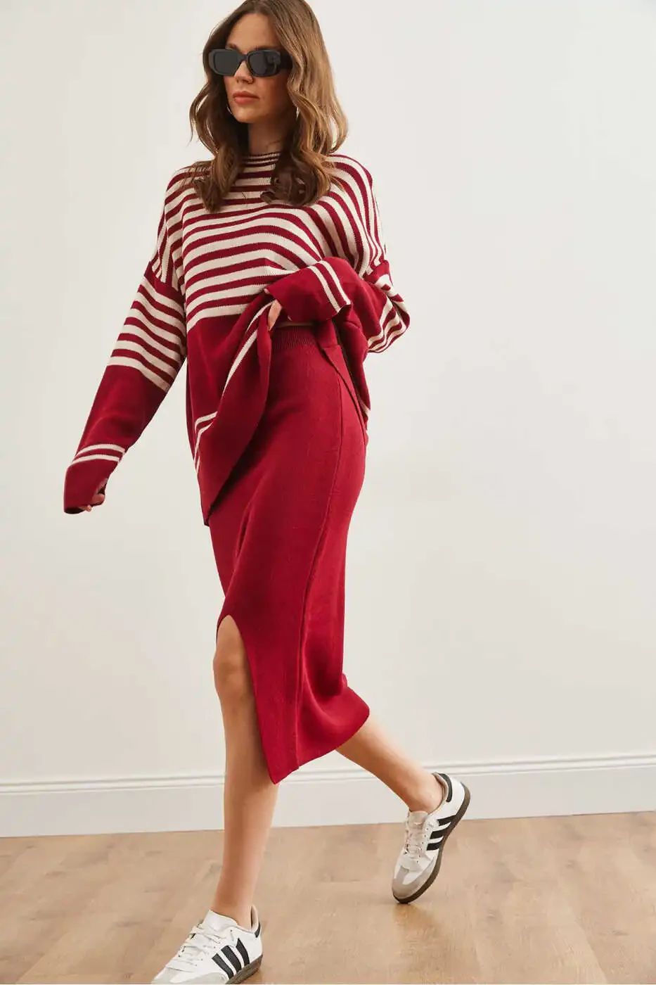 Bordo ust kazak va yostirmali yubka triko komplekti | Trendyol