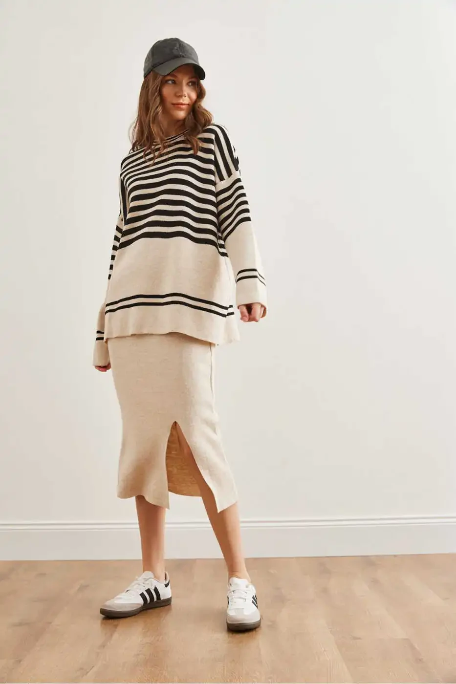 Ayollar toshlari yuqori kozok, pastki yorilgan yubka triko to'plam | 100% akril | 15 kun bepul qaytarish