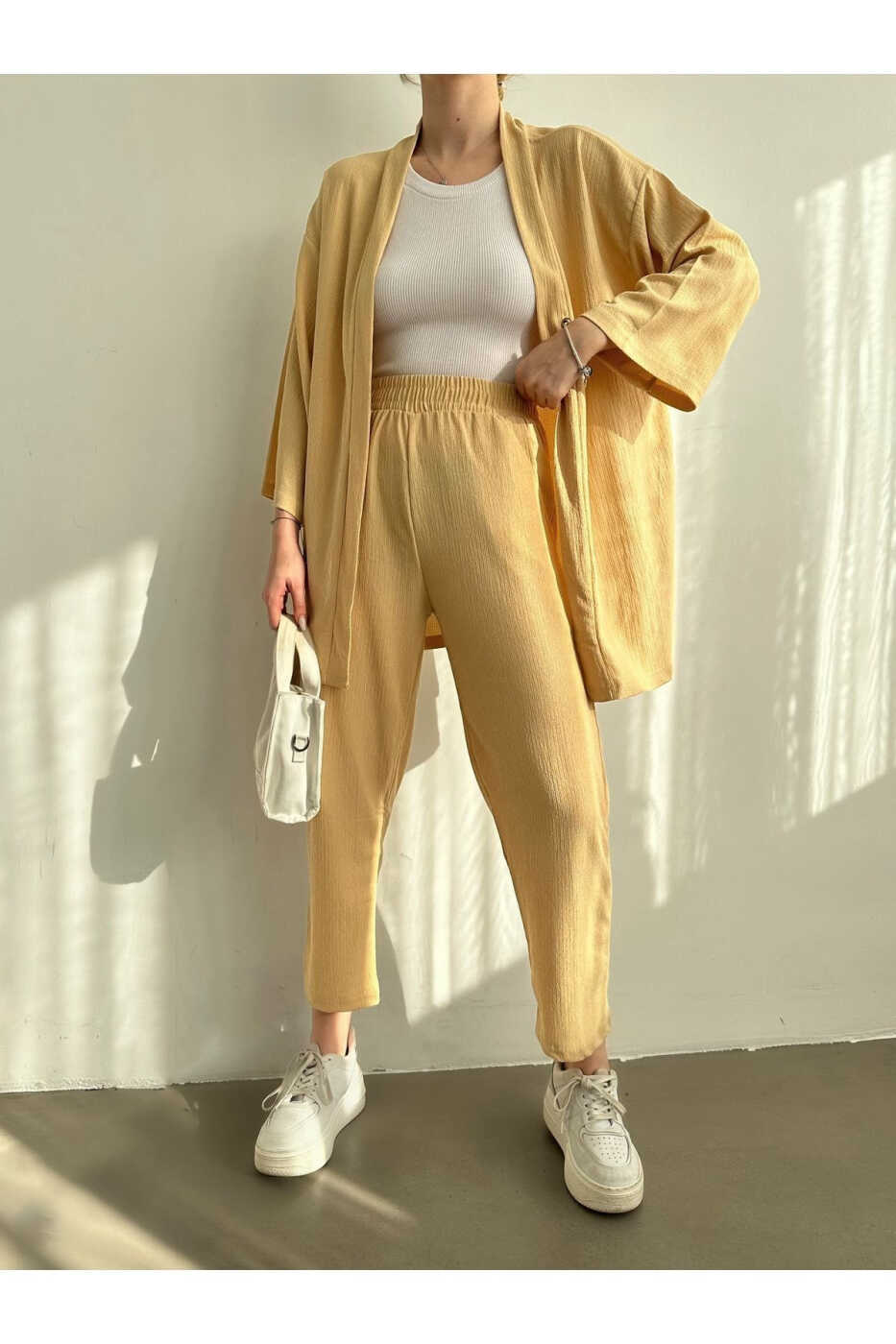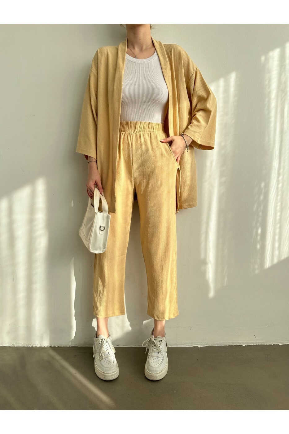 Bir vaqtning o'zida qulaylik va stilni qidiradigan ayollar uchun mo'ljallangan bej rangli to'qilgan kimono shimlar to'plamimiz bilan tanishing. Yengil va nafas oladigan matodan tayyorlangan bu to'plam kun bo'yi qulaylikni ta'minlaydi, shu bilan birga, uning zamonaviy dizayni har qanday muhitda ajoyib ko'rinish yaratishga yordam beradi.