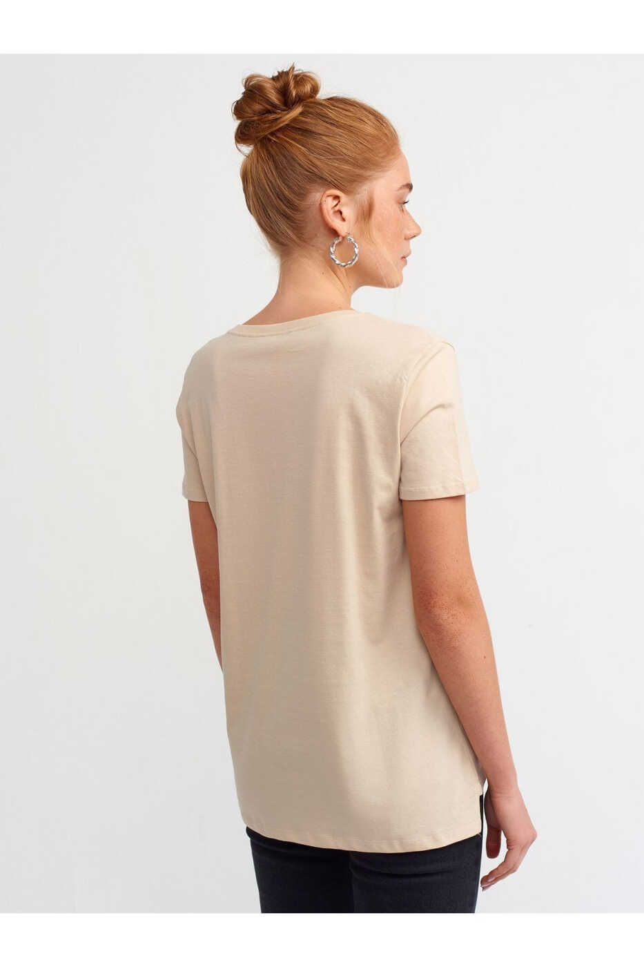 Ayollar uchun bej rangli V bo'yinli oddiy futbolka - bu har bir ayolning garderobida bo'lishi kerak bo'lgan zamonaviy va qulay variant.