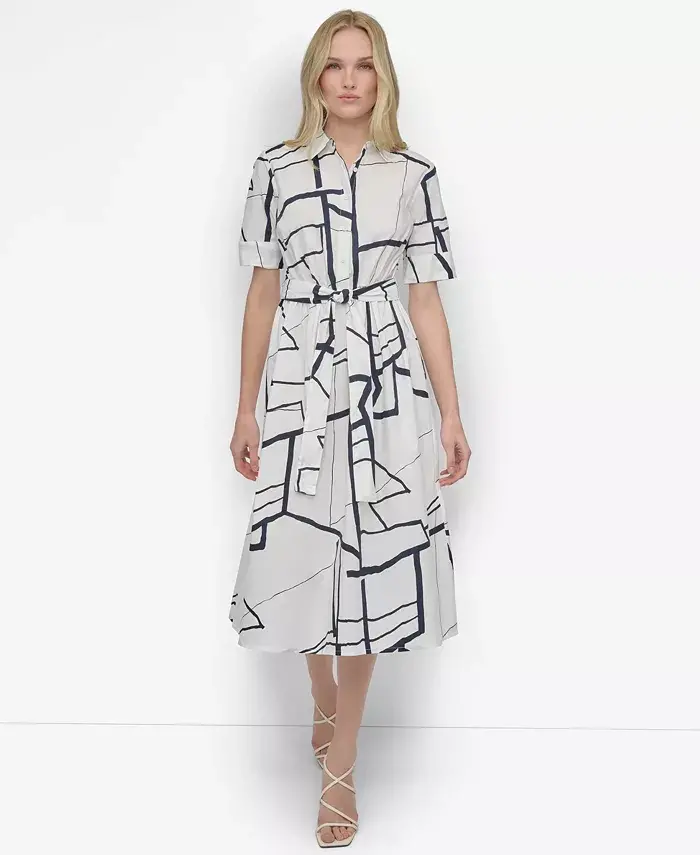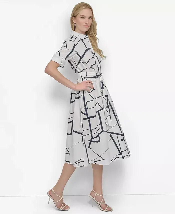 Paxta matodan ishlab chiqarilgan. Bosmali. Ko'ylak yoqali. Uzun yengli. Tugma qadalgan. Kamarli.
