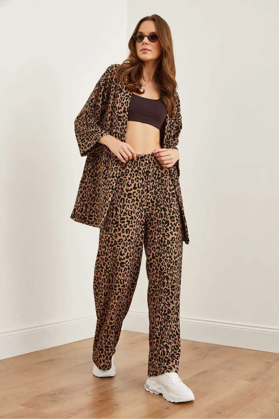 Trendyolda qora yuqori kurtka leopar palazzo to'plami