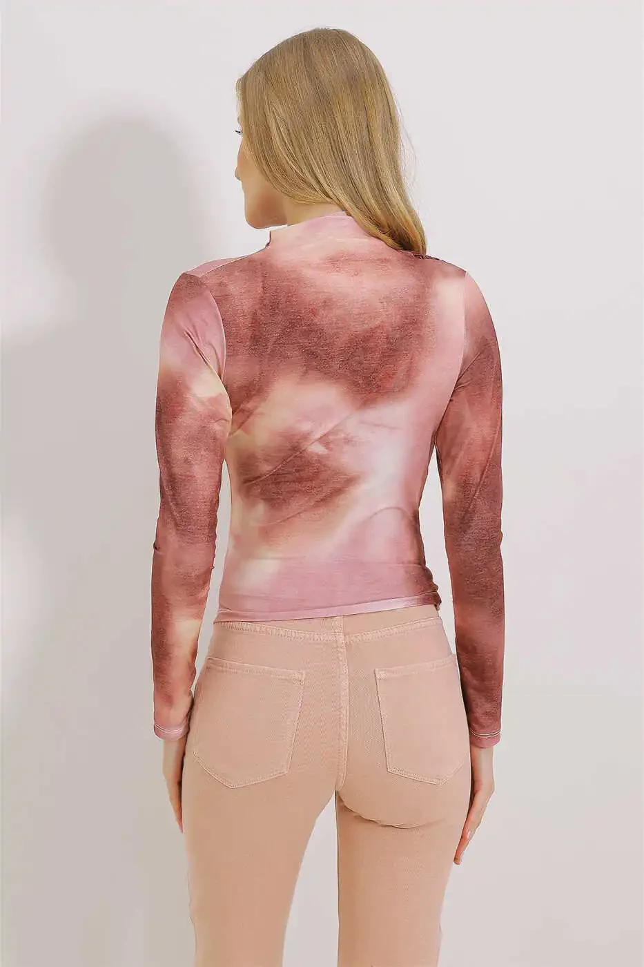 ayollar uchun bluzka, chang rangi bluzka, to'g'ri yoqali bluzka, yelkalari burmalangan bluzka, drapeli bluzka, naqshli bluzka, zamonaviy bluzka, qulay bluzka, ALC-X11131