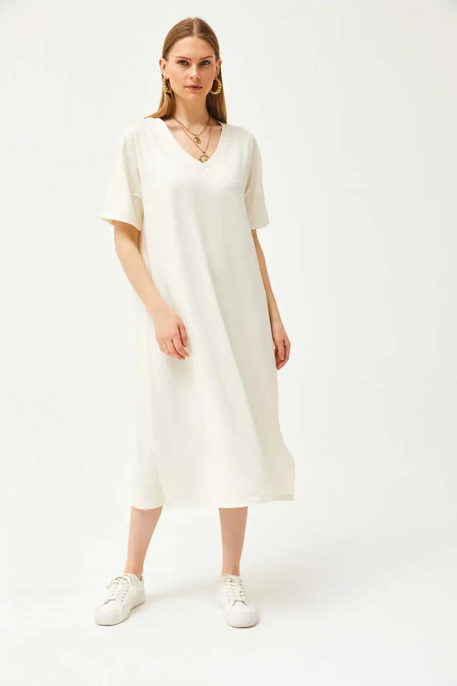 Agar siz uslub va qulaylikni birlashtirishni istagan ayollardan biri bo'lsangiz, Ekru rangli V bo'yinli yon tomondan yirtilgan yumshoq tuzilishli ko'ylak aynan sizga kerak!