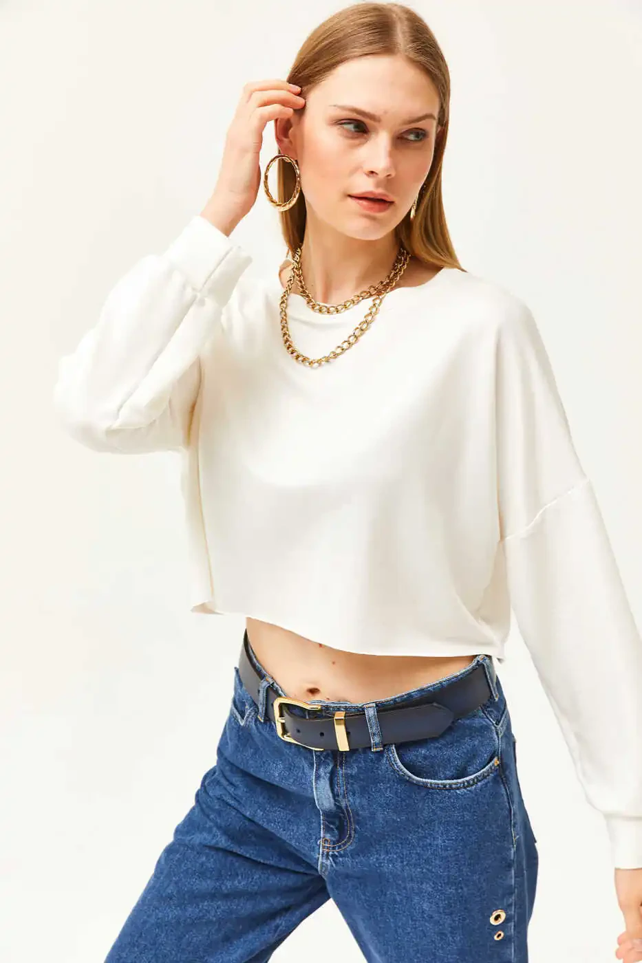 Ayollar uchun ekru rangli yumshoq modal matodan tikilgan yarasa yengli crop-top futbolka TSH-19000776 ni qanday kombinatsiya qilish mumkin?