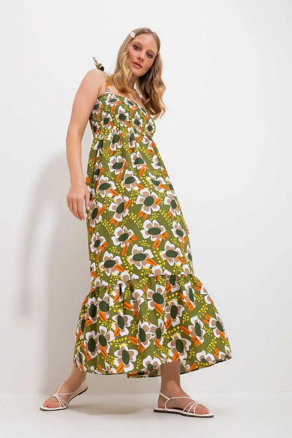 Nafislik va qulaylikni birlashtirgan bu libos sizning shkafingizning ajralmas qismiga aylanishga tayyor. Haki rangi har qanday uslubga mos keladigan neytral ohangni taqdim etadi, volanli yubkasi va gulli naqshli to'qilgan to'qimasi esa ayollikni qo'shadi. Bretellesiz dizayni sizni yozgi issiqda salqin saqlaydi, qulay kesimi esa kun bo'yi qulay harakat qilishingizga imkon beradi.
