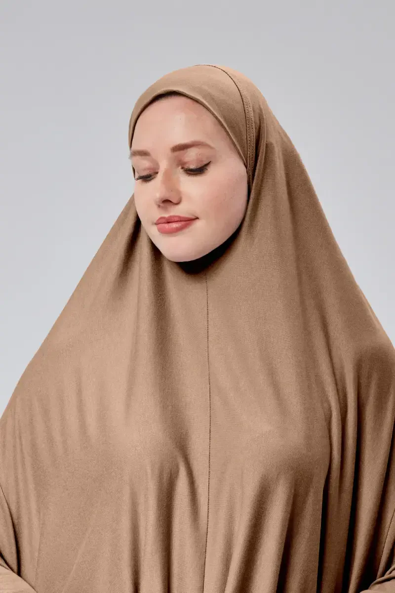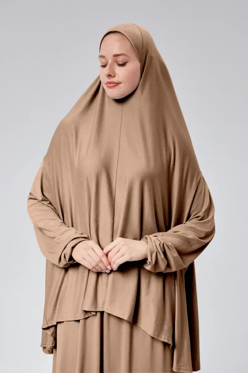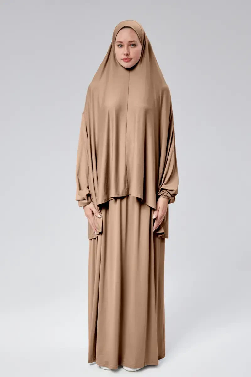 Namaz libosi, ayollar, tesettür, organik paxta, roʻmolli, ikki qismli, sutli qahva, penye, qulay, sirpanmaydigan yengli