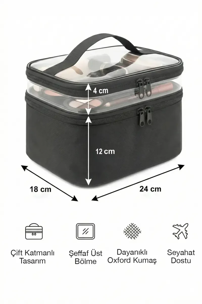 - Suv o'tkazmaydigan va bardoshli material bo'yanish vositalaringizni himoya qiladi.