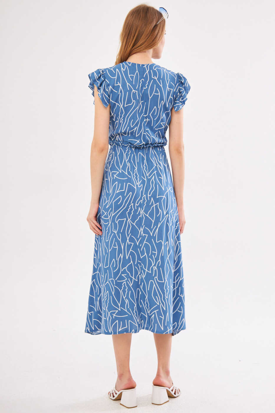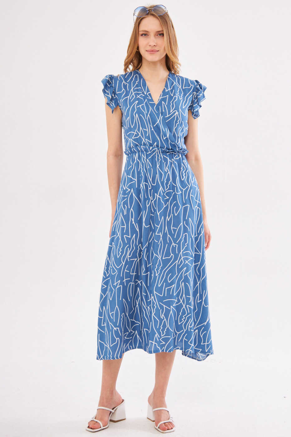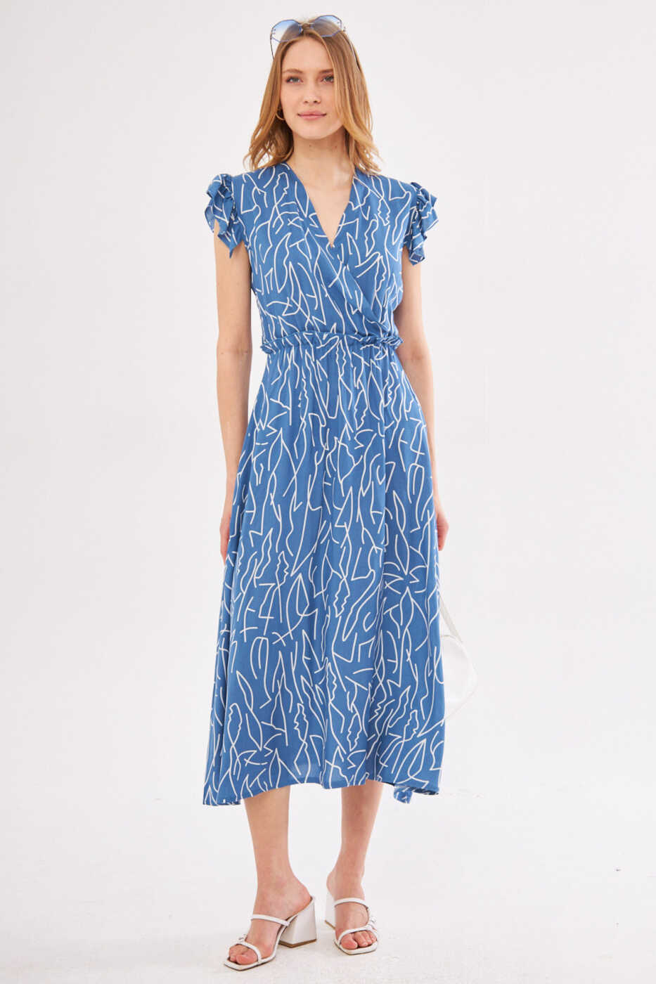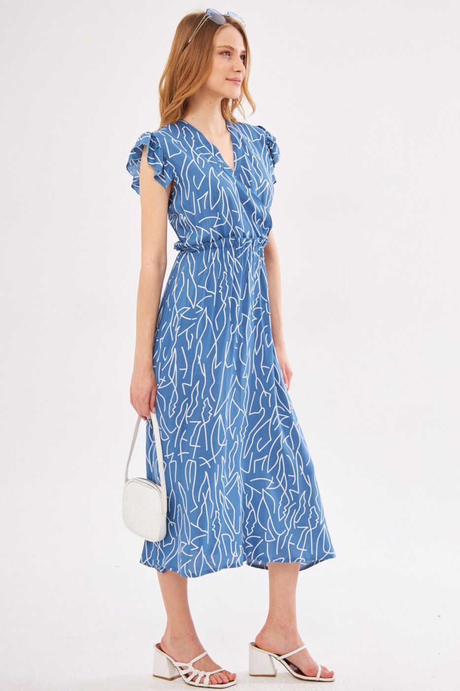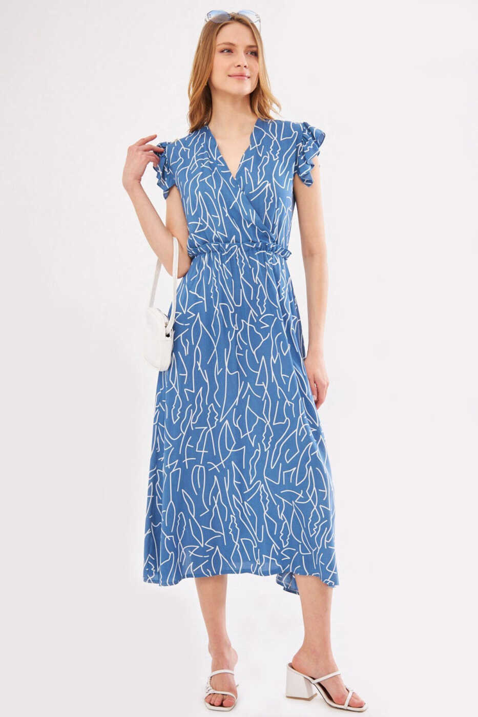 Ayollar uchun indigo midi ko'ylak, o'ralgan yoqa, yelkalaridagi jabroqlar, elastik bel ARM-24Y001020