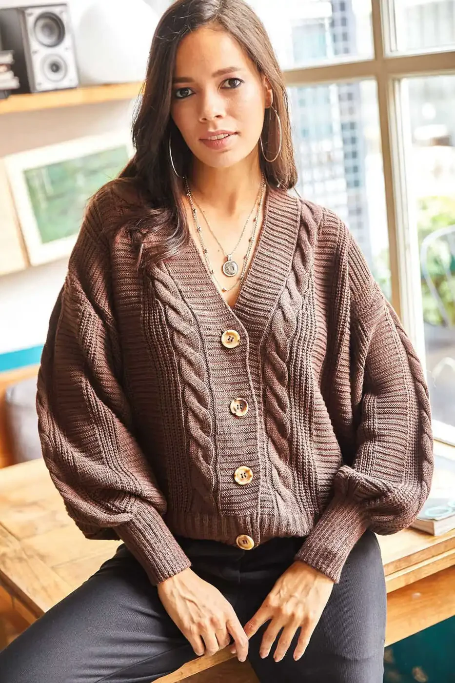 Ayollar uchun jigarrang qalin soch örgülü triko hırka: hashamatli va qulay uslub