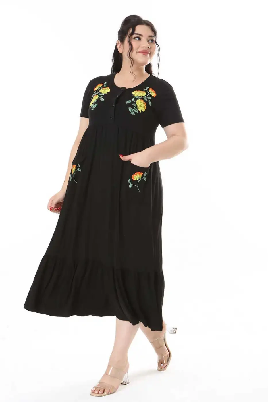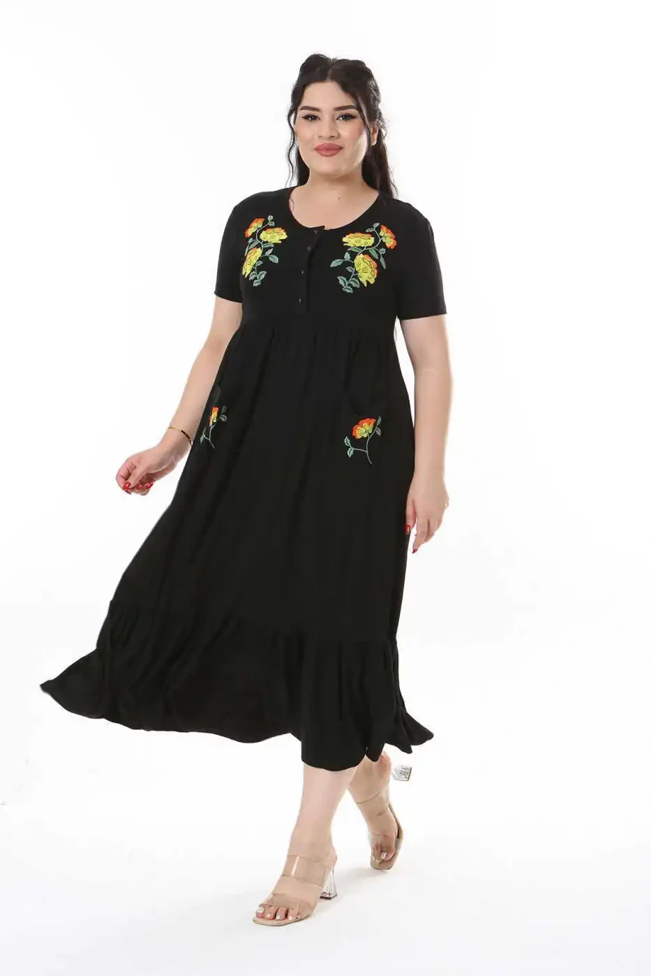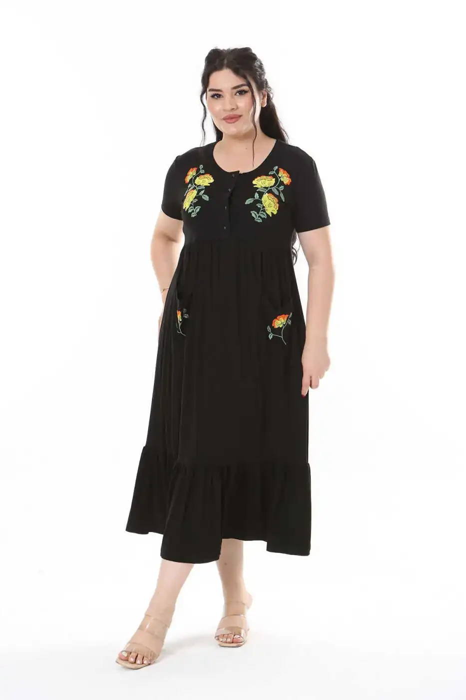 Mavsumning eng muhim elementi, katta o'lchamli ayollar uchun maxsus ishlab chiqilgan, qora rangdagi tikilgan tafsilotlarga ega oldingi qopqoq tugmalari bilan bezatilgan ko'ylagimiz bilan tanishing! Nozik va nazokatli siluetga ega bo'lgan bu ko'ylak har bir o'lchamda bo'lgan ayolni o'ziga maftun etadi.