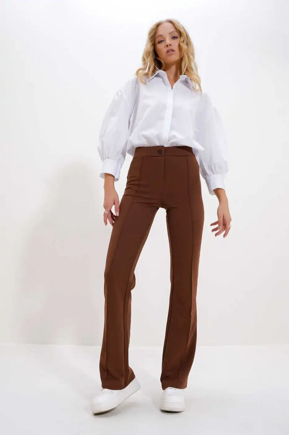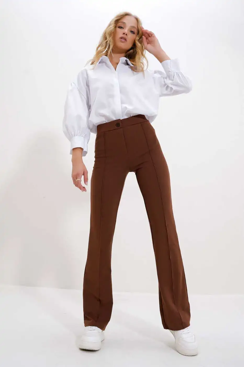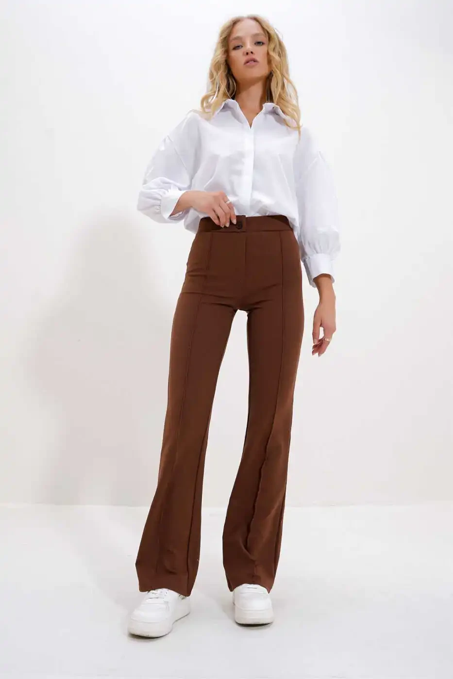 Uslub va qulaylikni birlashtirgan Ayollar uchun Kofe Rangi Yuqori Belli Old Tomonidan Yoriqli Keng Oyoqli Likrali Shim ALC-X9979 sizning garderobingizning ajralmas qismi bo'ladi. Yuqori beli bilan sizning siluetiingizni mukammal darajada ta'kidlaydigan shim, old tomonidagi yoriqlar bilan zamonaviy ko'rinish beradi. Keng oyoqlari tufayli harakat erkinligini taqdim etadigan shim, likrali tuzilishi bilan kun bo'yi qulaylikni ta'minlaydi.
