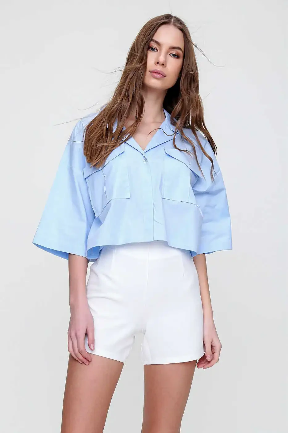 Ayollar uchun ko'k konvert cho'ntakli qisqa poplin ko'ylak ALC-X6045 | Uslubli va qulay