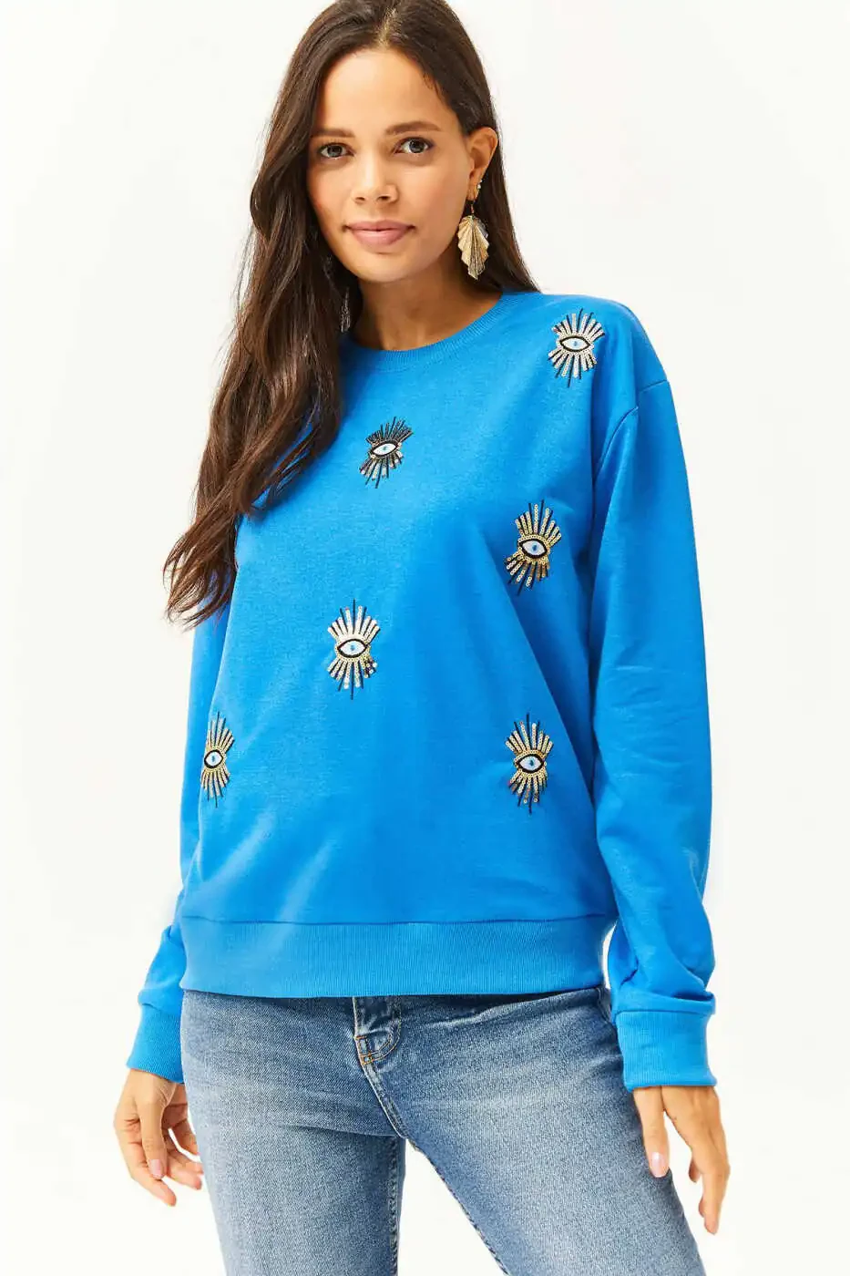 Ayollar uchun ko'k ko'zli mavsumiy sweatshirt bilan uslubingizga o'ziga xos teginish qo'shing