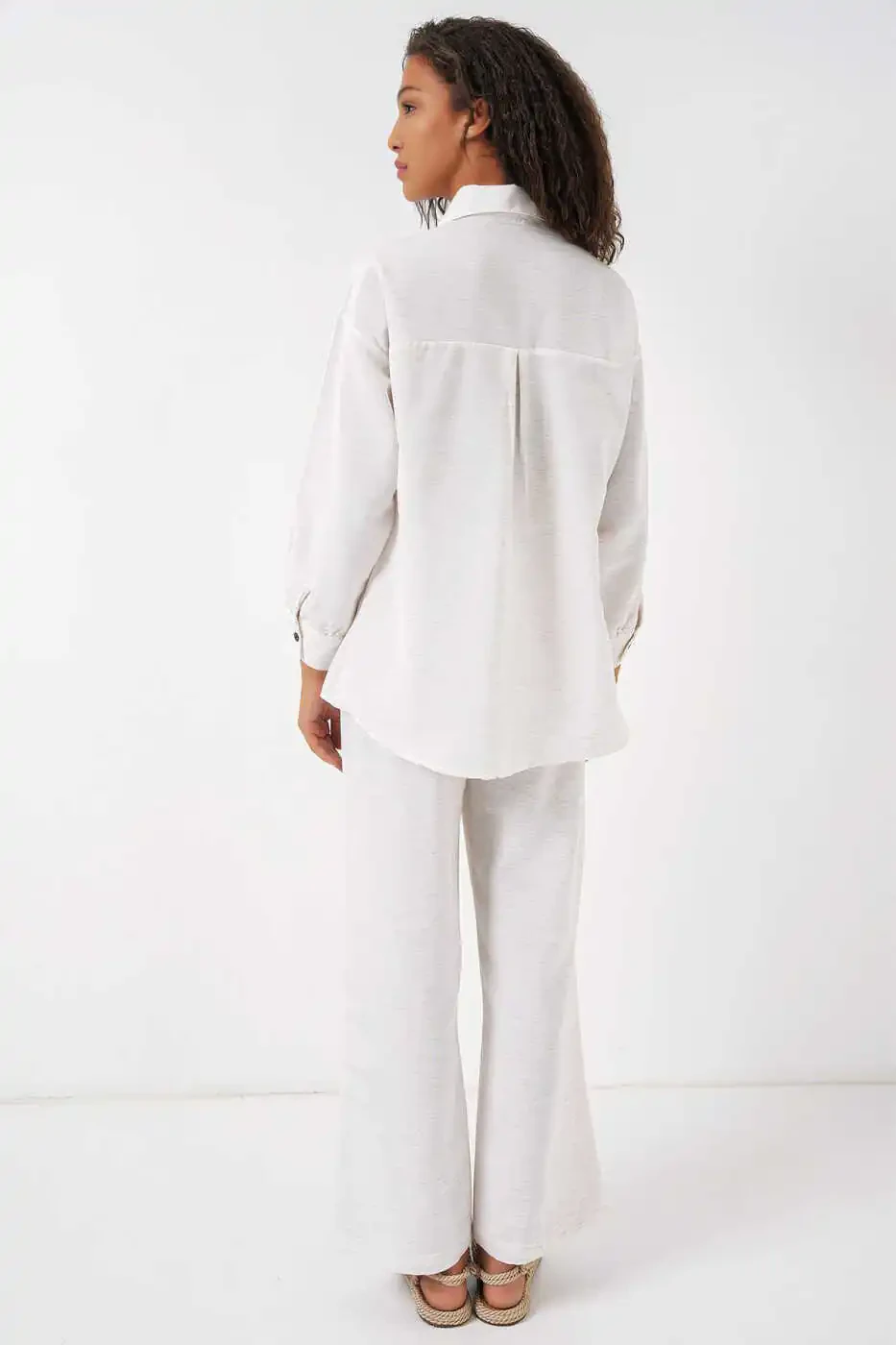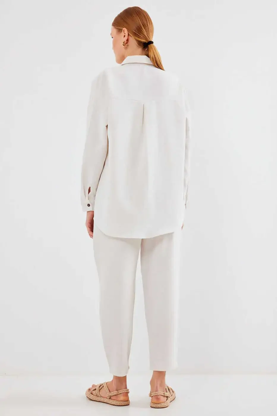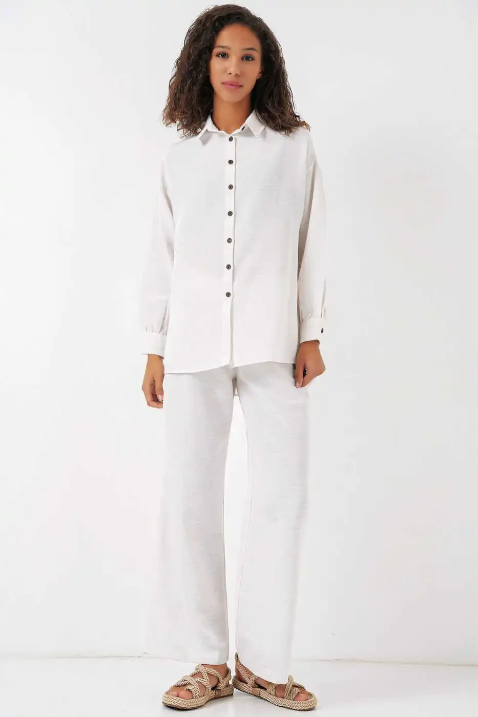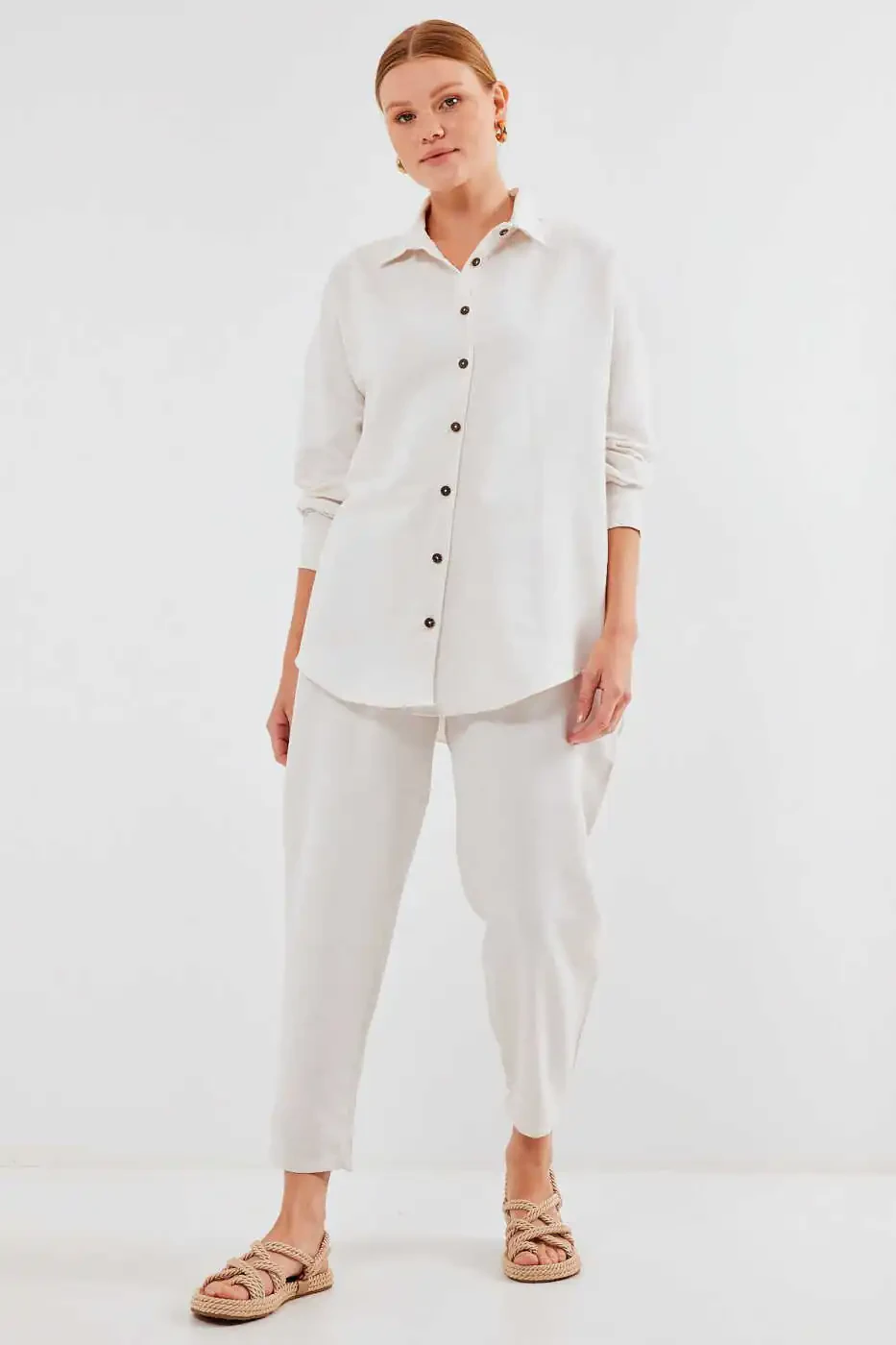 Ayollar uchun krem rangli o'lchamli zig'ir kostyumi 6622 - Konfor va uslubning uyg'unligi