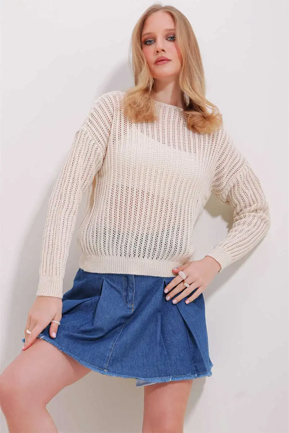 Ayollar uchun krem rangli qayiq yoqali ajurli triko bluzkasi ALC-X11510 - Zamonaviy va Qulay