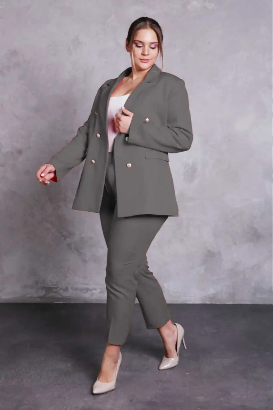 blazer ko'ylagi, kostyum, ayollar kiyimi, plus size, kulrang ko'ylagi, shim, truba shaklidagi shim, kamar, cho'ntakli shim, zamonaviy kiyim, ofis kiyimi, maxsus tadbirlar uchun kiyim