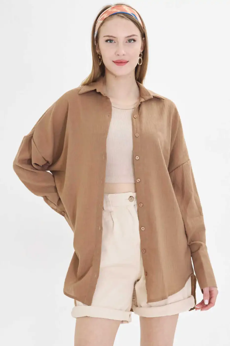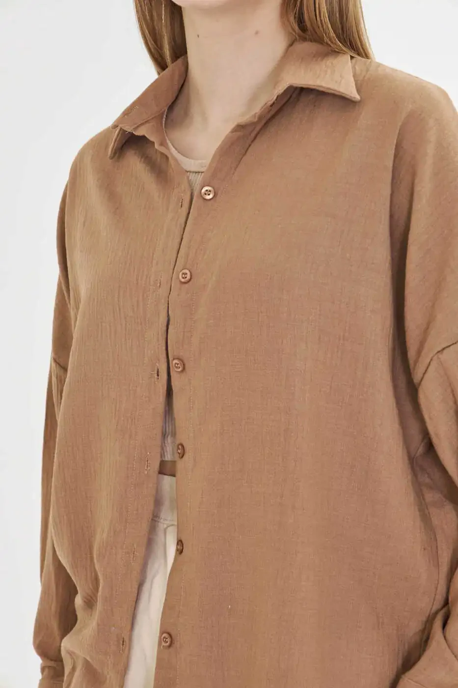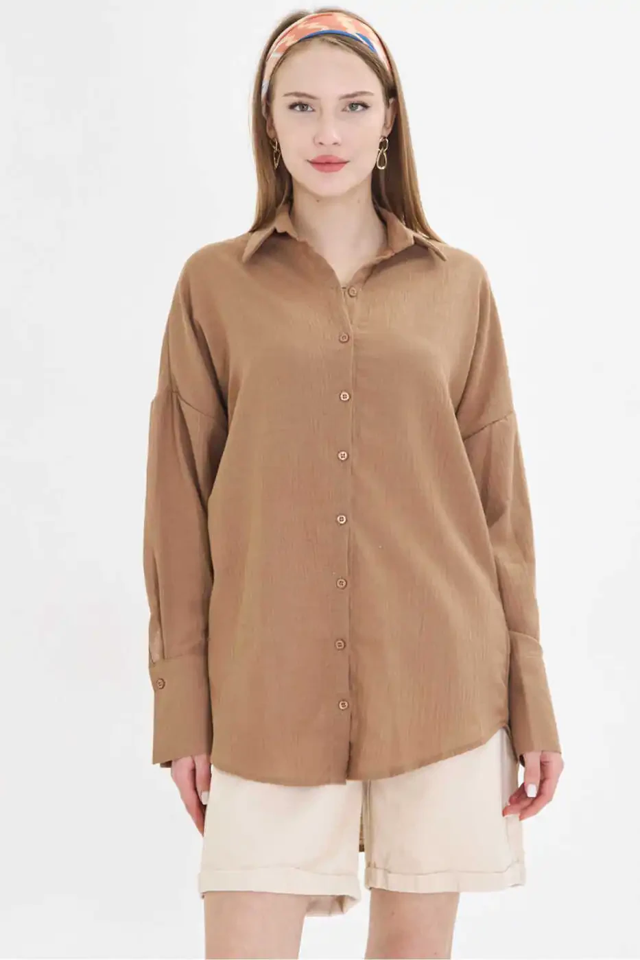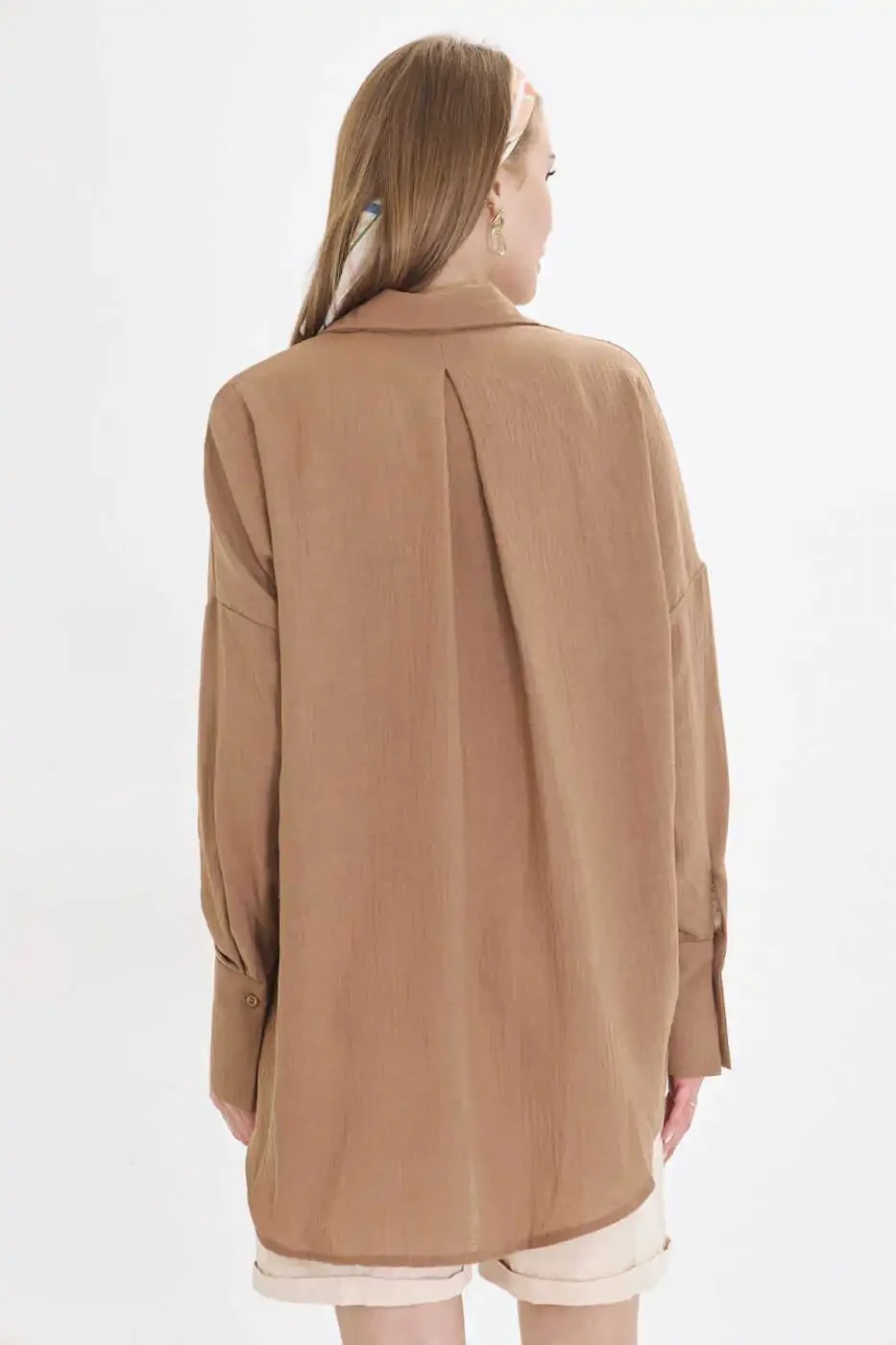 Qulaylik va uslubni birlashtirgan bu keng ko'ylak yozning ajralmas qismi bo'ladi! Ochiq jigarrang rangi va to'qimalgan zig'ir ko'rinishidagi matosi sizni yozgi issiqda salqin va qulay saqlaydi. Keng yenglari esa uslubingizga nafislik qo'shadi.