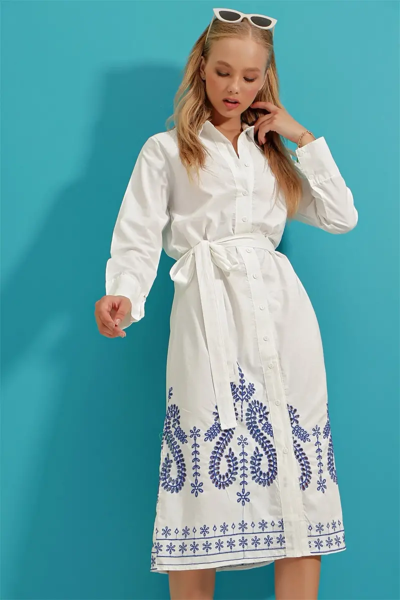 Ayollar uchun oq yubka bilan tikilgan poplin ko'ylak ko'ylak - ALC-X9216