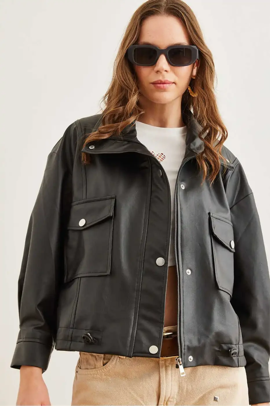 **Ayollar uchun qora rangli astarli cho'ntakli tortma detalli sun'iy charm charm kurtka CKT-19000397**