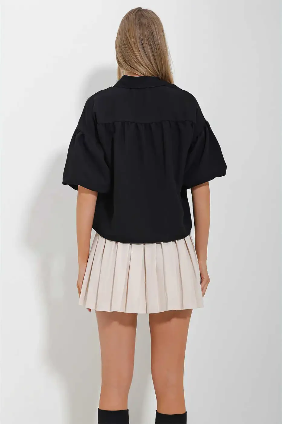 Ayollar uchun qora balon yengli Kubra chiroyli paxta crop ko'ylakni jinsi shim, yubka, leggings yoki shortilar bilan birlashtirish orqali zamonaviy va qulay ko'rinish yaratish mumkin. Kundalik kiyim uchun ideal bo'lgan bu ko'ylakni maxsus tadbirlar uchun ham tanlash mumkin.