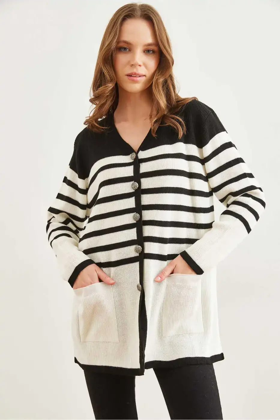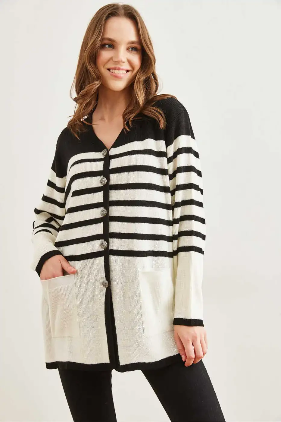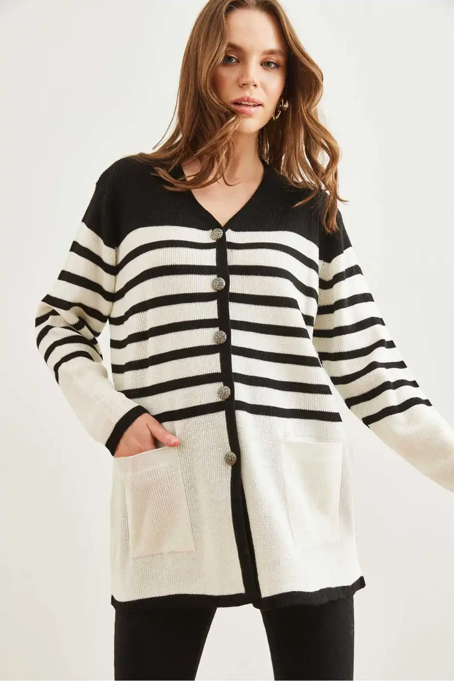 Ayollar Qora Chiziqli Metall Tugmali Triko Kurti | Olalook