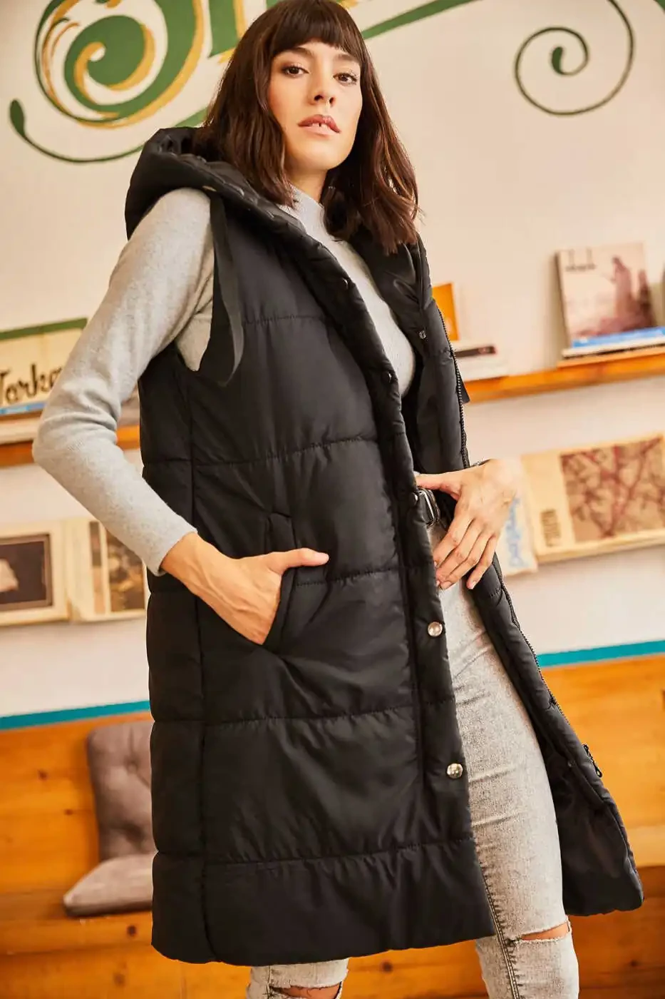 Ayollar uchun qora rangli kaputli cho'ntakli puf yelegi YLK-19000007 bilan qish faslini iliq va zamonaviy o'tkazing!