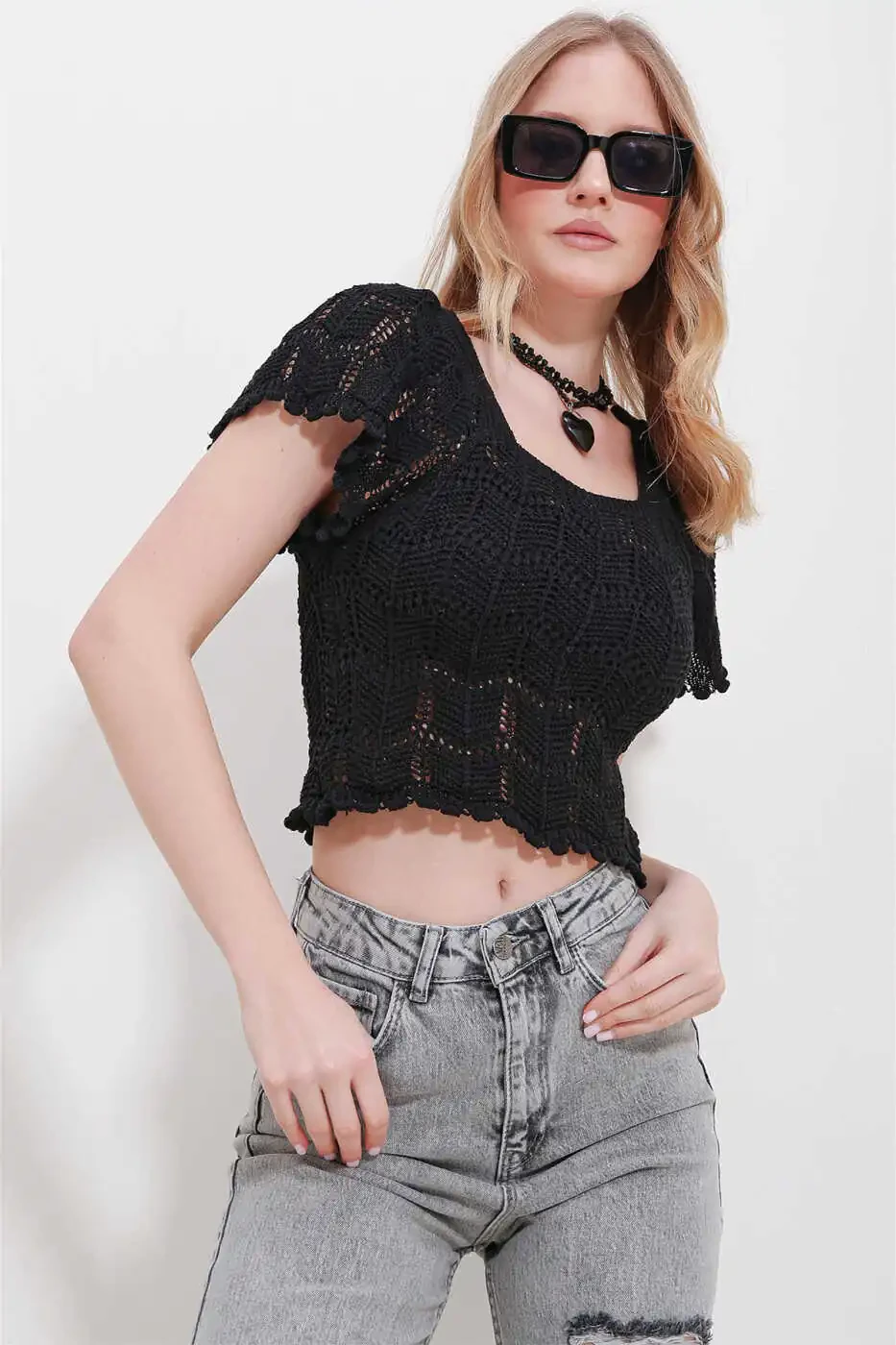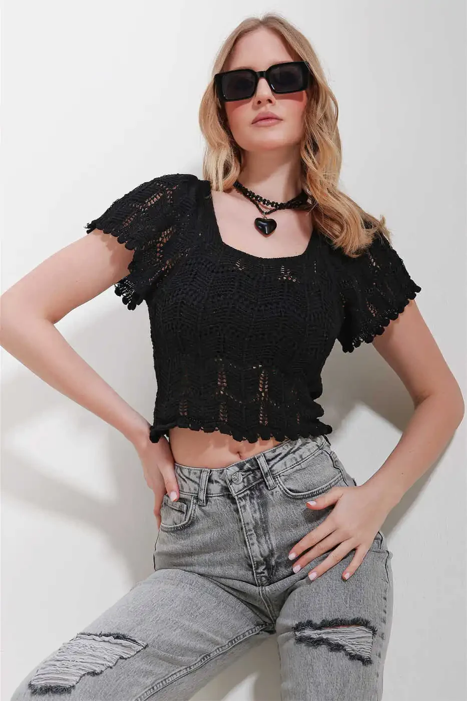 Ayollar uchun qora kvadrat bo'yinli tikilgan ajurli triko bluzkasini jinsi shimlar, yubkalar yoki shortilar bilan birlashtirishingiz mumkin. Blazer kurtkasi va baland poshnali poyabzallar bilan to'ldirganingizda, siz zamonaviy va oqlangan ko'rinishga ega bo'lasiz.