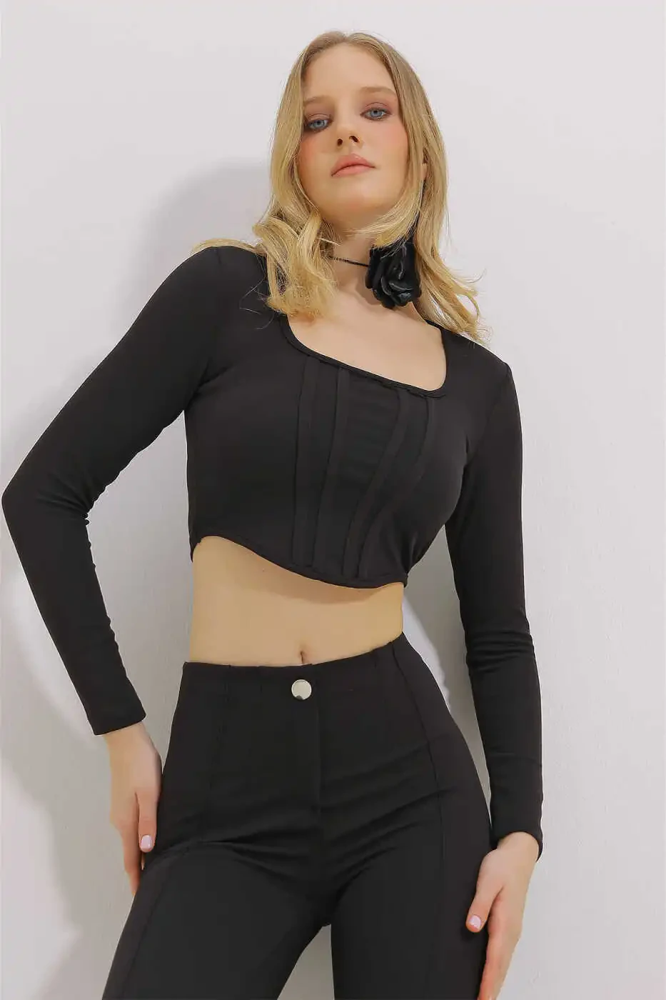 Ayollar uchun Qora Kvadrat Yaka Oldingi Tikma Crop Bluzka bilan o'zingizning uslubingizni namoyish eting!