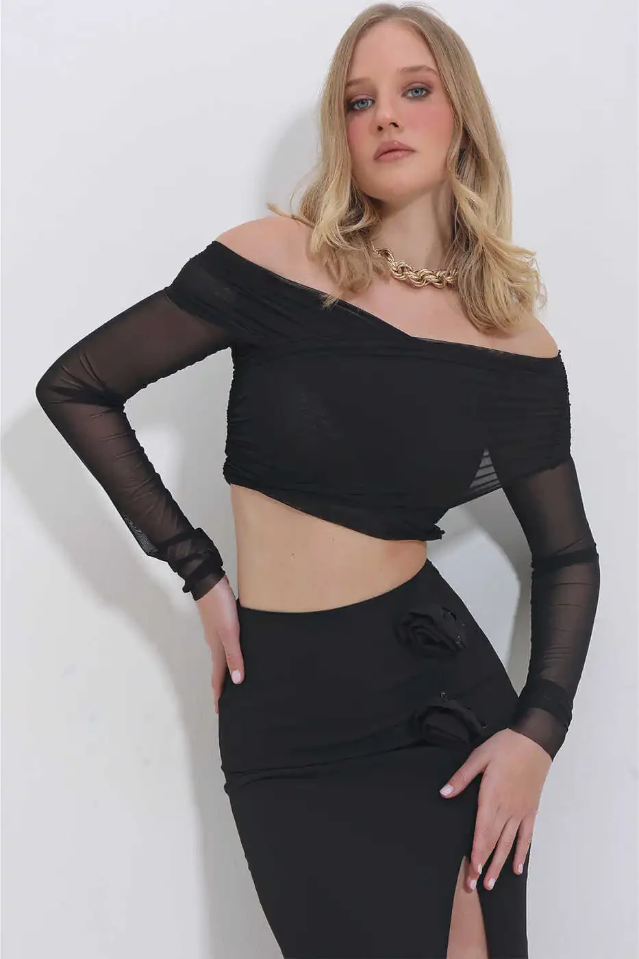 Ayollar uchun qora rangli old va orqa V shaklidagi yoqa bilan, tul detali qisqa ko'ylagi ALC-X11387 yuqori sifatli materiallardan tayyorlangan. Qulay va nafas oladigan matoni tufayli uni kun bo'yi qulaylik bilan kiyishingiz mumkin. Har qanday maxsus kun yoki kundalik foydalanish uchun ajoyib tanlov bo'lgan bu ko'ylagi, har qanday uslubga mos keladi va sizni odatdagidan ham oqlangan qiyofada ko'rsatadi.