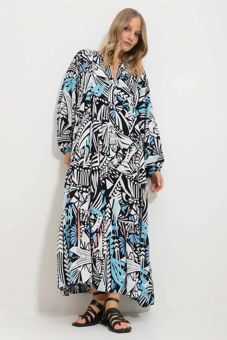 Ayollar uchun qora va oq rangli mandarin yoqa bilan, sharf naqshli Maxi ko'ylak Alc-X11593 kundalik kiyimlaringizga sport poyabzallari yoki sandallar bilan zamonaviy ko'rinish yaratishi mumkin, to'y marosimlari uchun esa yuqori poshnali poyabzallar va oqlangan sumka bilan to'ldirishingiz mumkin. Bu ko'ylak shkafingizda ajralmas narsa bo'lib, har doim oqlangan va o'zingizga ishongan holda yurishingizga imkon beradi.