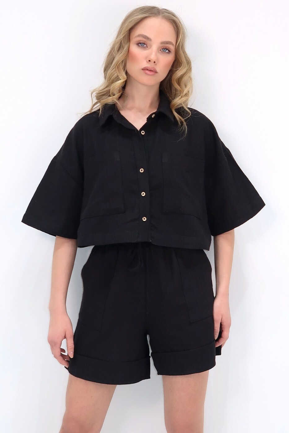 Ayollar uchun qora rangli ikki cho'ntakli zig'ir ko'ylak va shortilar to'plami ALC-X12261 bilan yozni zavqlaning. Kuningizni plyajda, shaharda yoki uyda o'tkazing, har qanday muhitda uslubingizni saqlang.