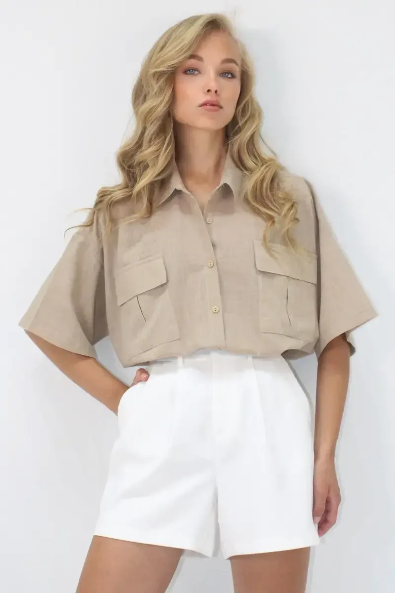 Issiq yoz kunlarida zamonaviy va qulay uslubni qidiradiganlar uchun ajoyib tanlov bo'lgan Ayollar uchun qum rangli ikki cho'ntakli yarim yengli zig'ir ko'ylak tabiiy zig'ir matosi ishlab chiqarilgan bo'lib, nafas oladigan tuzilishi bilan kun bo'yi qulaylikni ta'minlaydi. Yengil va zamonaviy ko'rinishni taqdim etadigan bu ko'ylak kundalik foydalanishdan tortib maxsus tadbirlarga qadar har qanday holat uchun idealdir.