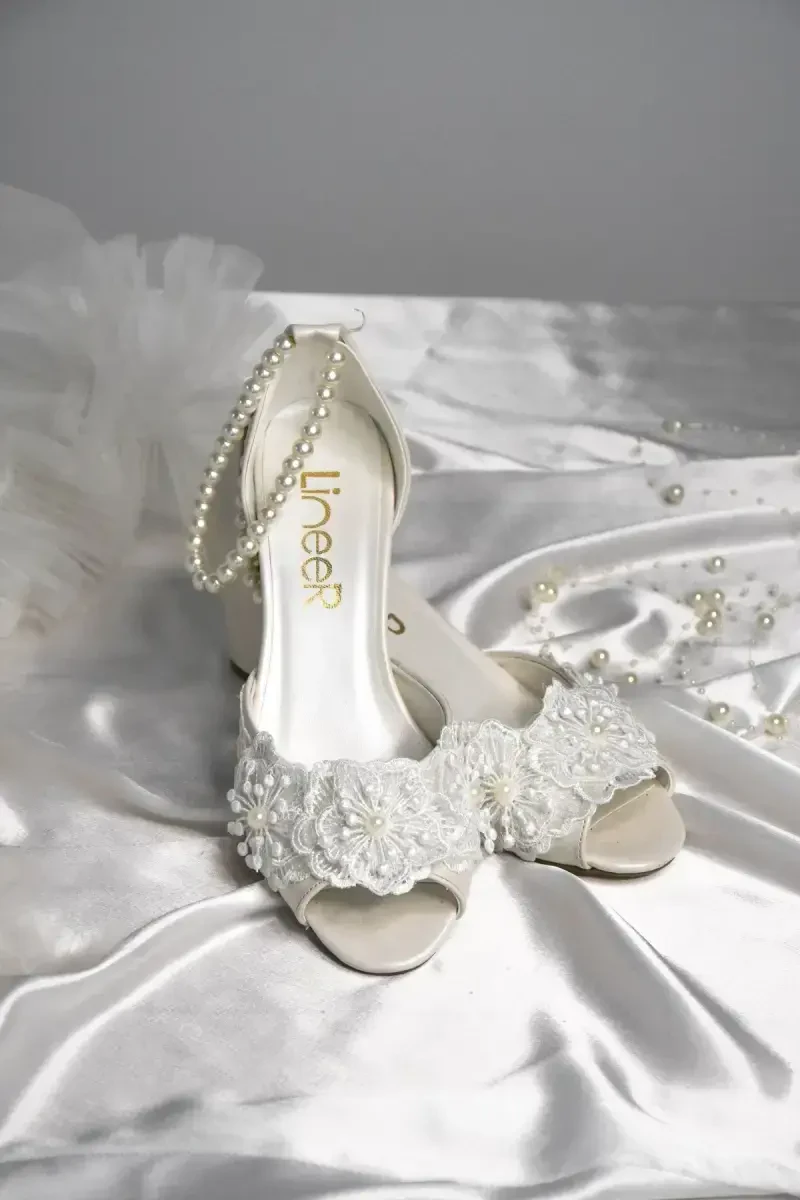 Agar siz orzuingizdagi to'y libosini to'ldiradigan yoki maxsus kunlaringizni unutilmas qiladigan poyabzal qidirsangiz, Ayollar uchun Sedefrang oq rangli dantelli qulay 5 sm qalin poshnali kechki to'y poyabzali aynan siz uchun!