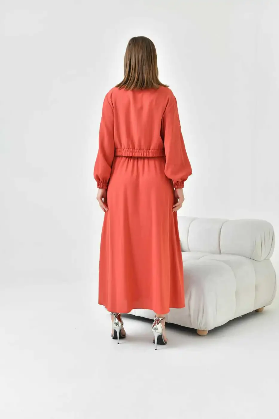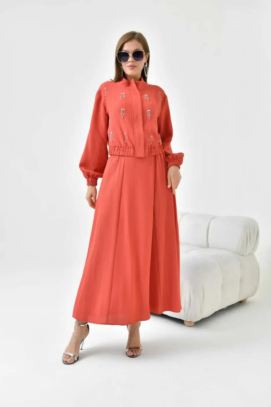 Ayollar uchun simli krep yubkali kostyum - Terrakotta 30839