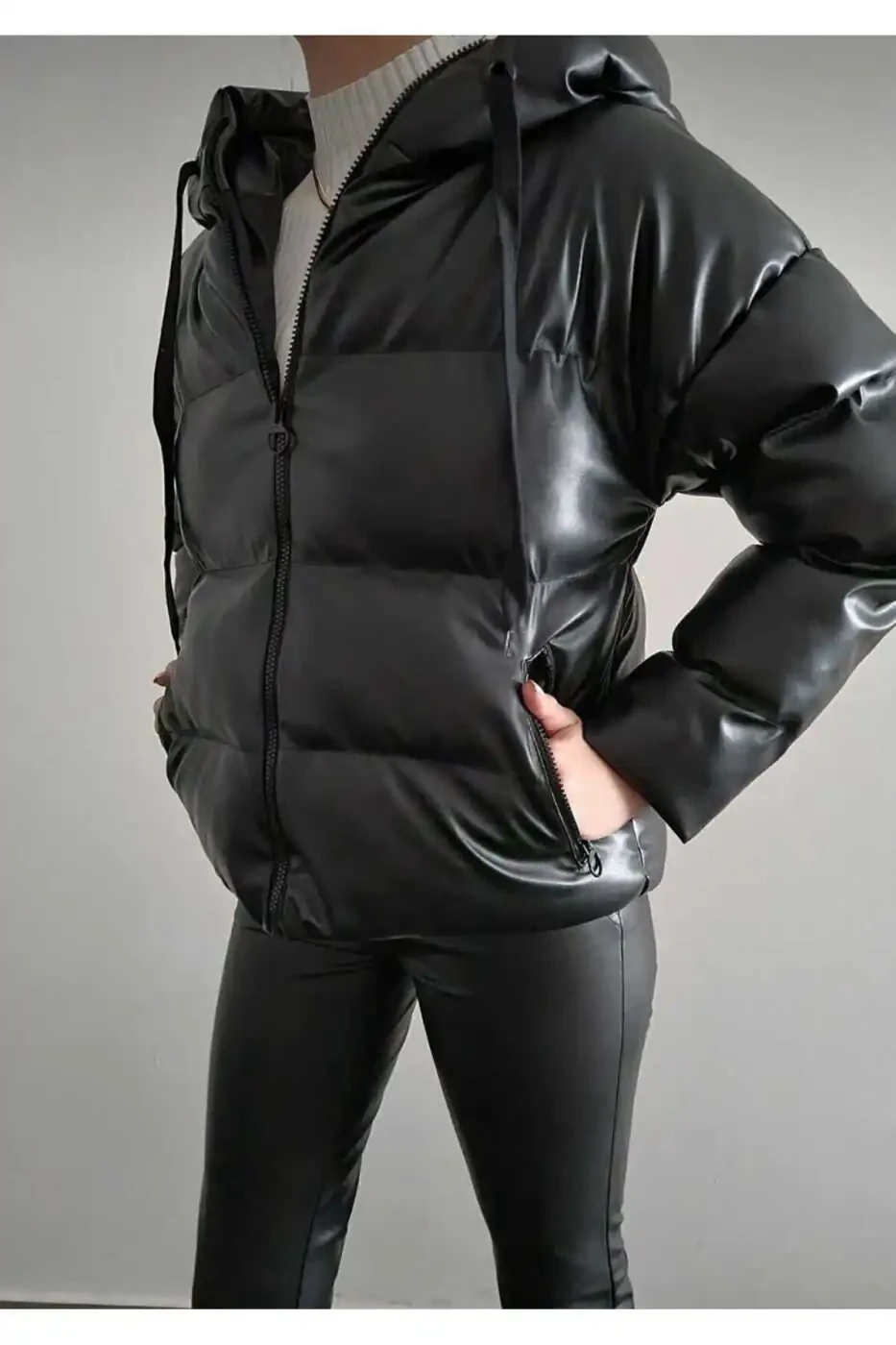Sovuq qish kunlarida issiq va chiroyli bo'lish uchun Ayollar uchun teri kaputli qora puf ko'ylagini hoziroq buyurtma qiling!