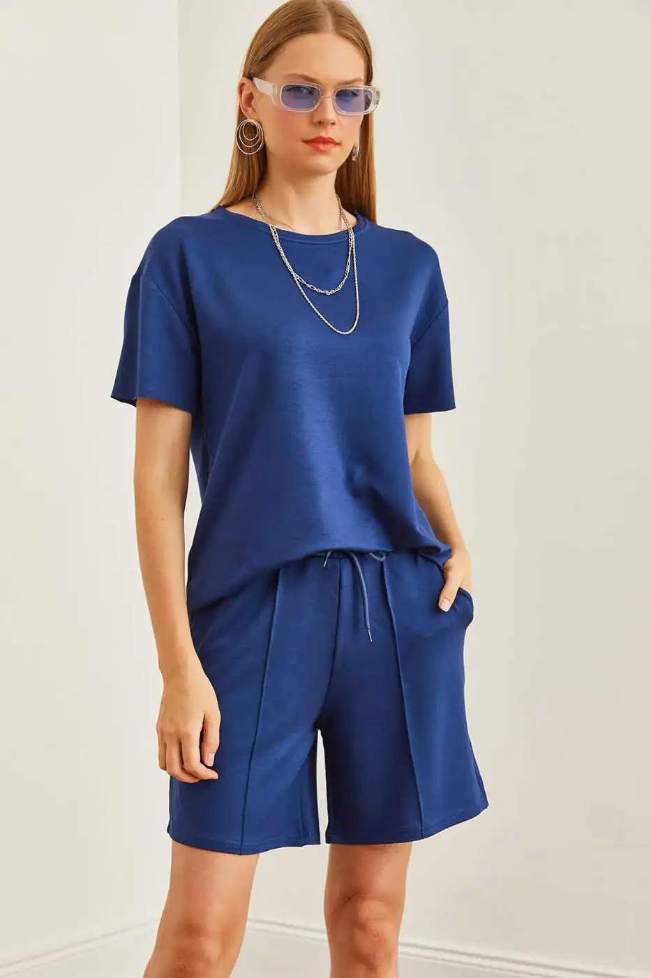 Lacivert oval futbolka, cho'ntakli shimlar, ayollar uchun to'plam, 100% paxta, tez yetkazib berish, bepul qaytarish