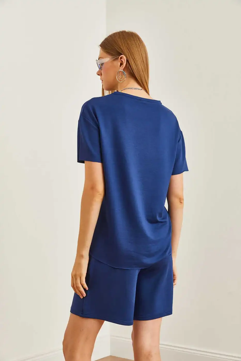 Ayollar uchun lacivert oval futbolka va cho'ntakli shimlar to'plami TKM-19000303