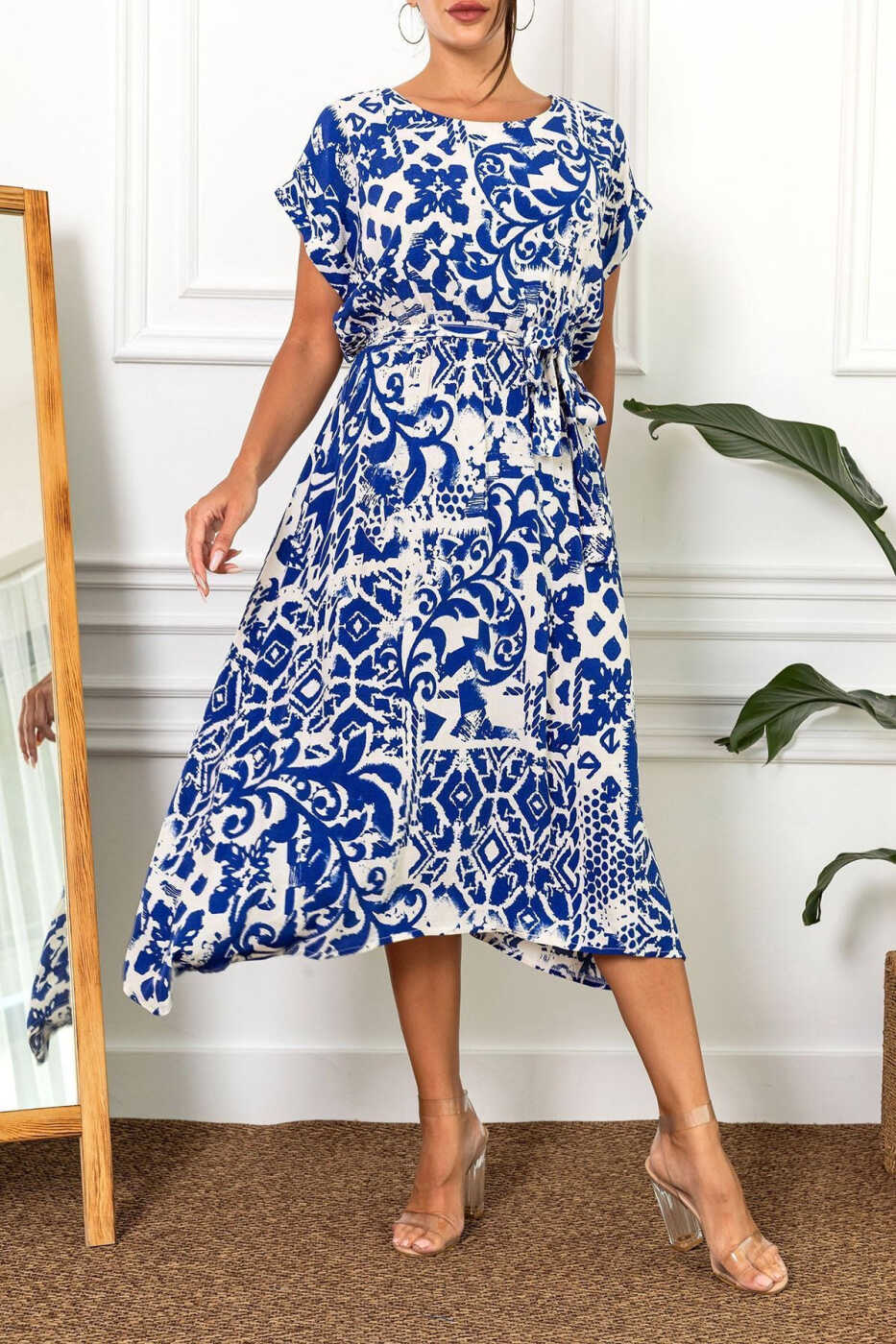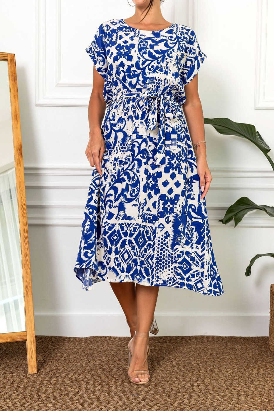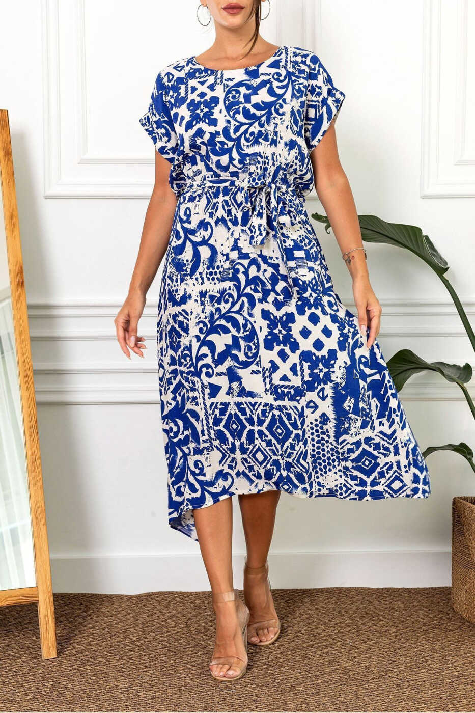 Ayollar uchun xantal rangli elastik belbog'li naqshli ko'ylak - ARM-22Y001044