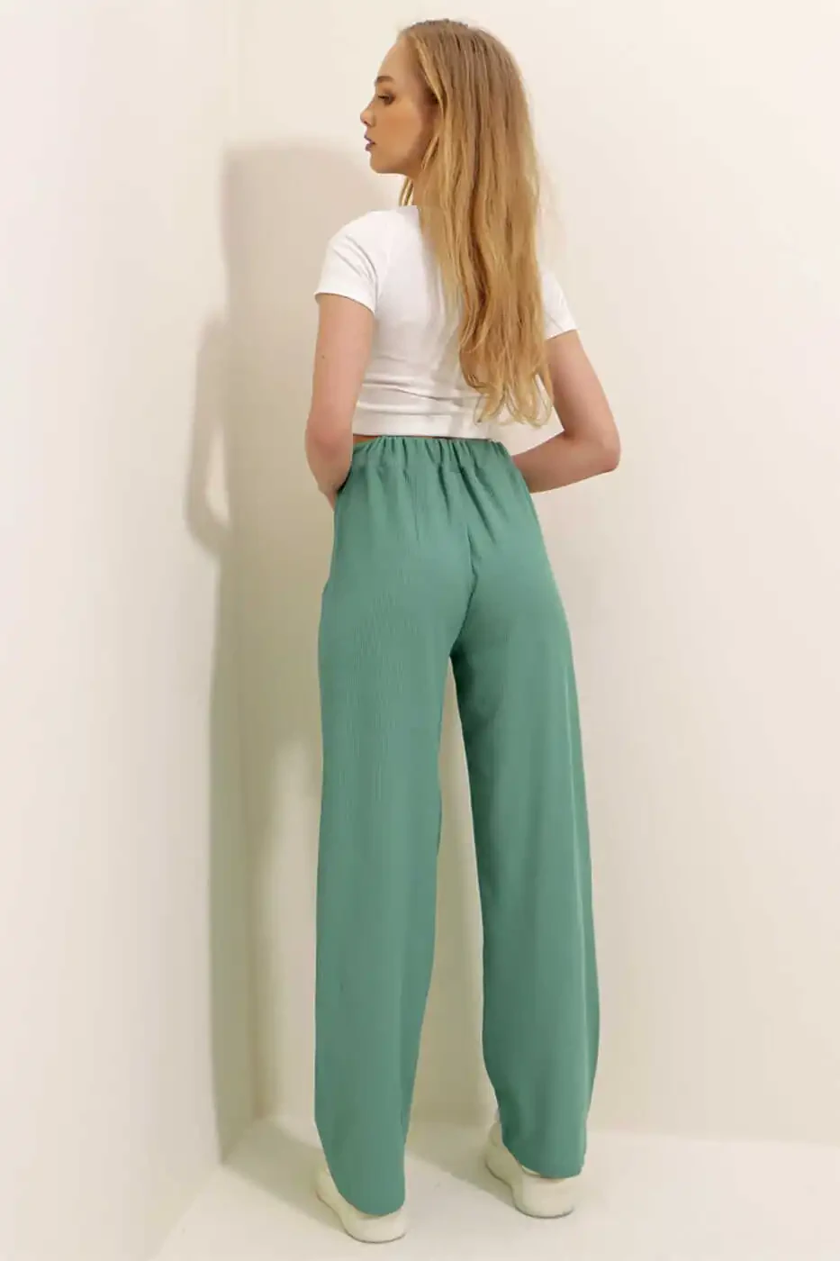 Ayollar uchun yalpiz rangli yuqori bel keng oyoqli shim ALC-X8141 bilan uslub va qulaylikni birgalikda boshdan kechiring. Kundalik uslubingizni to'ldirish uchun mukammal tanlov bo'lgan bu shim garderobingizning ajralmas qismi bo'ladi.