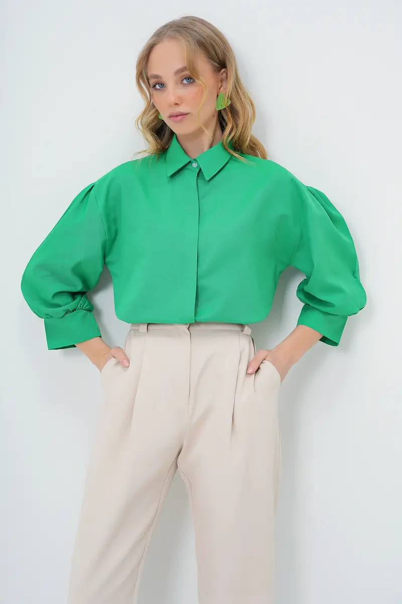 Ayollar uchun yashil sharsimon yengli yashirin tugmali asosiy poplin ko'ylak ALC-X9654 - Zamonaviy va qulay