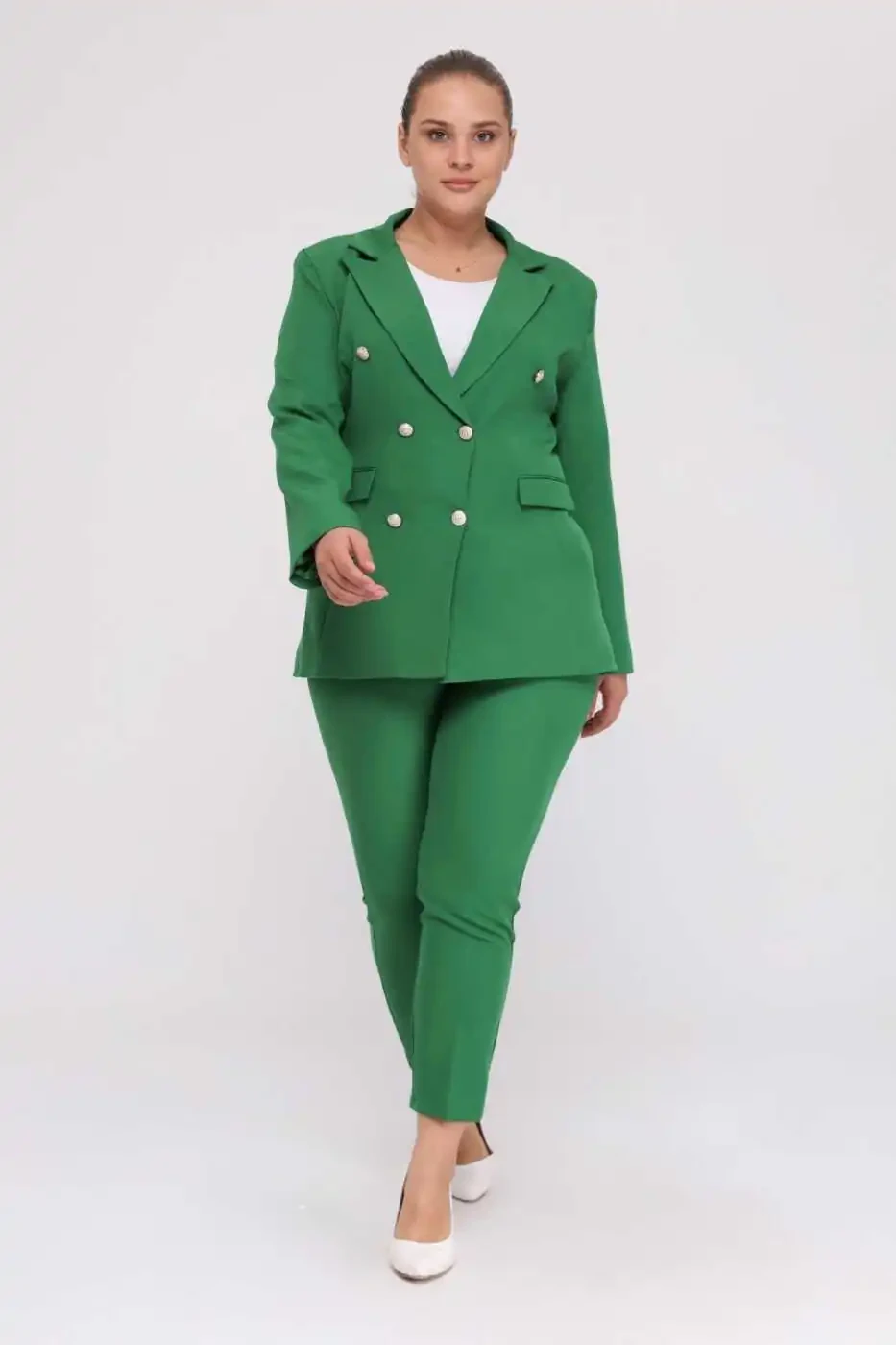 Ushbu ajoyib kostyum bilan har qanday muhitda diqqat markazida bo'ling, u uslub va qulaylikni birlashtiradi! Nafis yashil Blazer ko'ylagi, zamonaviy keng oyoqli shim va belingizni ta'kidlaydigan kamar ayollik qiyofasini yaratadi. Yuqori sifatli matodan tikilgan kostyum nafas olish va qulaylikni kafolatlaydi. Har qanday tana turiga mos keladigan katta o'lchamli variantlar bilan, bu kostyum sizga maxsus kunlar yoki kundalik hayot uchun zamonaviy qiyofani yaratishga yordam beradi.