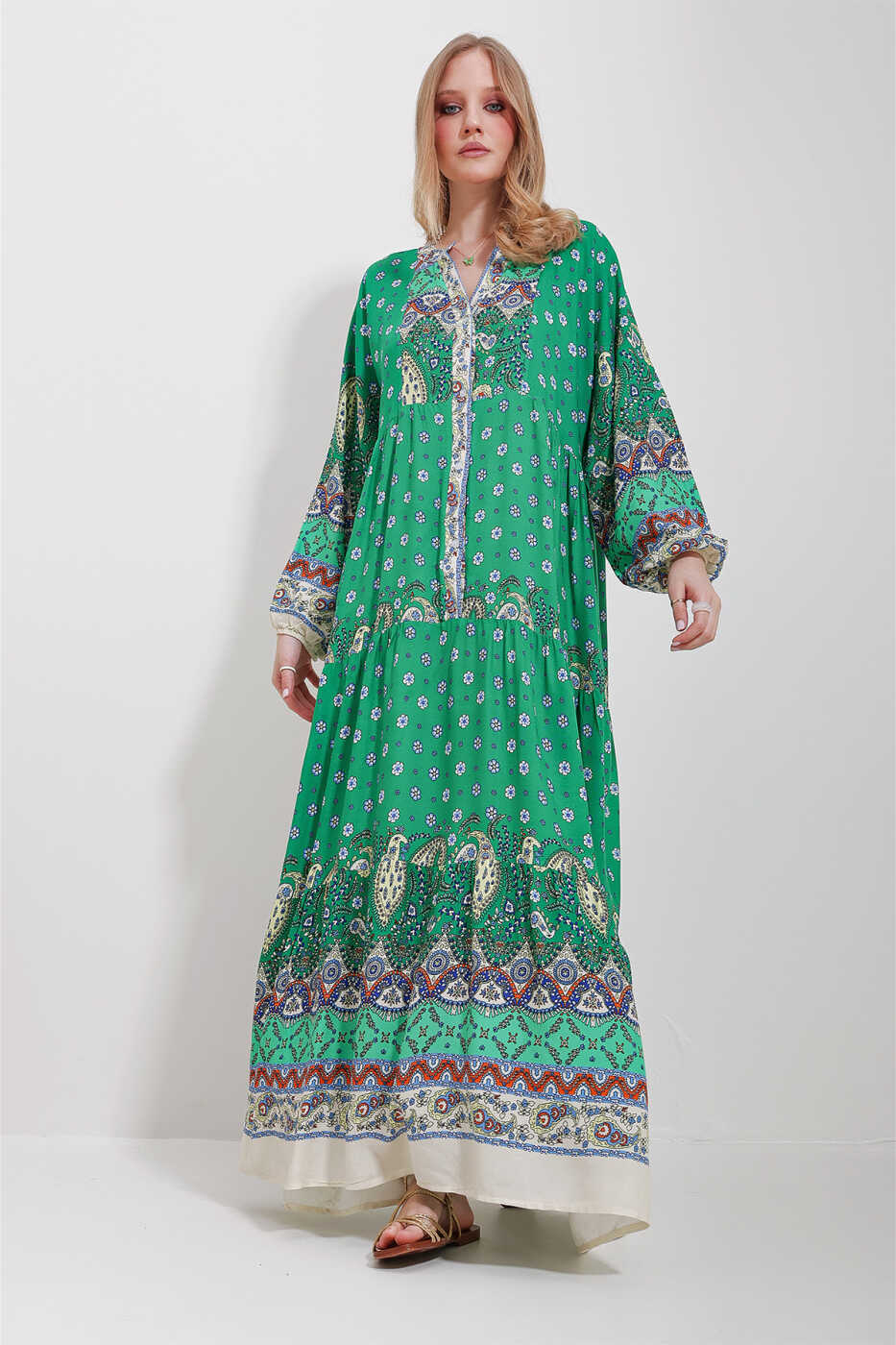 ayollar uchun ko'ylak, maxi ko'ylak, yashil ko'ylak, mandarin yoqali ko'ylak, sharf naqshli ko'ylak, ALC-X11593, ko'ylak modellari, ko'ylak sotib olish