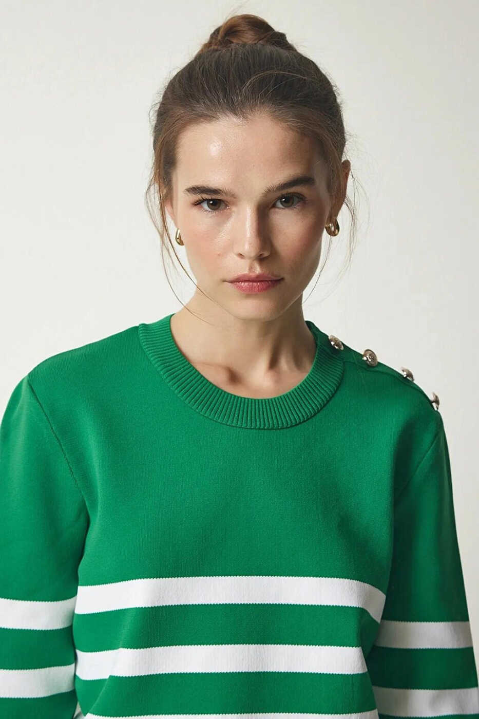 Ayollar uchun yashil va oq chiziqli, yelkadan tugma detallari bilan jihozlangan bisiklet yoqali ko'ylagi
