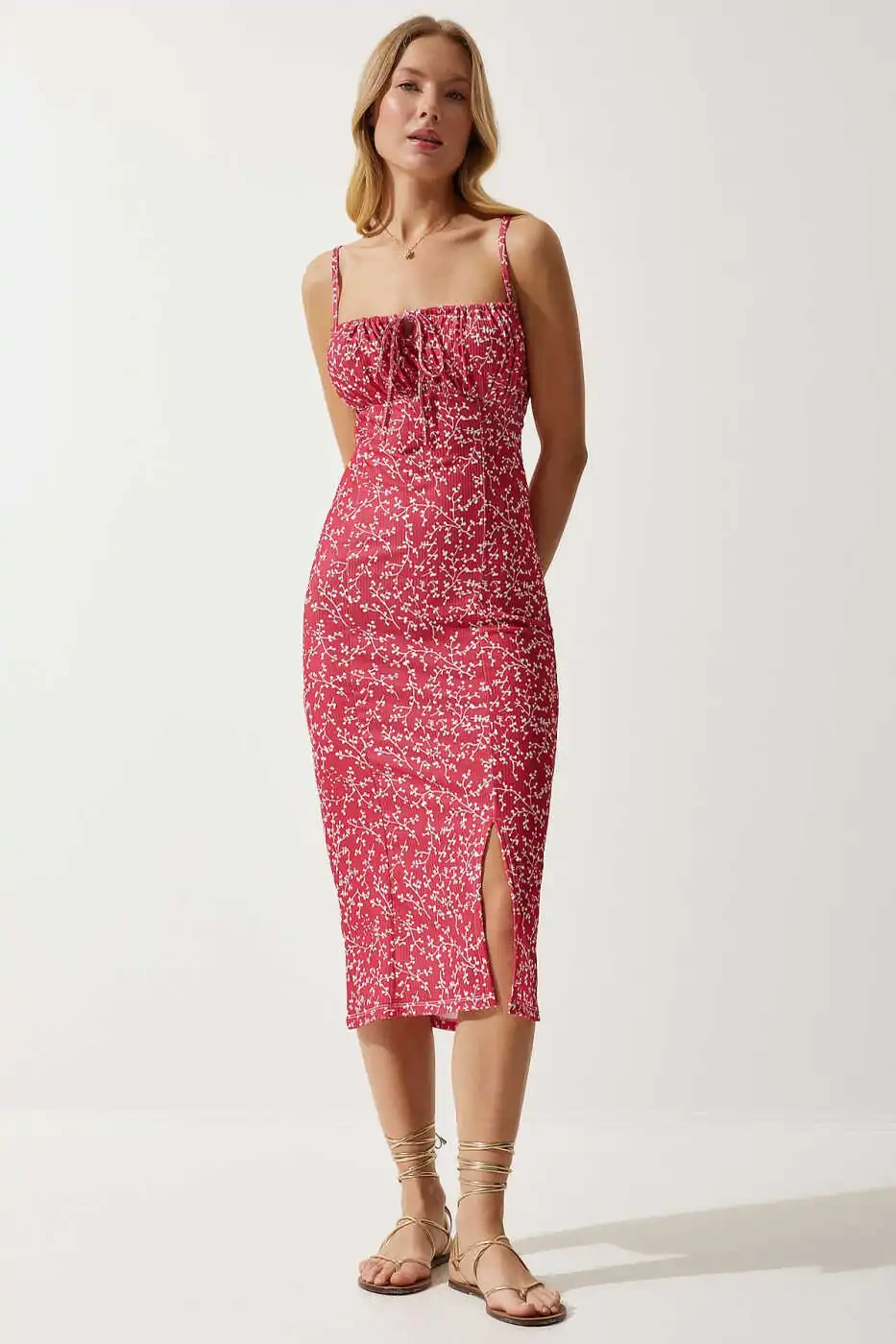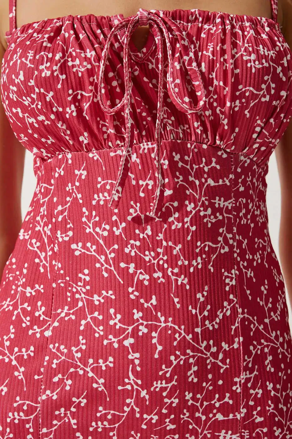 Issiq yoz kunlarida o'zingizning nafisligingizdan voz kechmasdan qulaylikni his qilmoqchi bo'lsangiz, Ayollar uchun to'q pushti oq gulli yoriqli yozgi triko libos CI00029 aynan siz uchun! Bu libos yorqin to'q pushti rangi va oq gulli naqshlari bilan ko'zni qamashtiruvchi dizaynga ega. Yoriq detali esa ham harakat erkinligini ta'minlaydi, ham nazokatli teginish qo'shadi. Christmas kolleksiyasiga maxsus ishlab chiqilgan dizayni bilan yangi yil ruhini aks ettiruvchi bu libos, maxsus kunlaringizda va kundalik hayotingizda nafisligingizni to'ldiradi. Polyester va elastan aralashgan matodan tikilganligi tufayli libos ham bardoshli, ham tanangizga mukammal mos keladi. Triko matoning yumshoq tuzilishi teringizga yumshoq teginsa, bodycon silueti tanangizning chiziqlarini nafis tarzda ta'kidlaydi. Yengsiz yeng tuzilishi bilan yoz issig'ida salqin va qulay bo'lishingizni ta'minlovchi libos, midi uzunligi bilan har qanday joyga mos keladi. Yurak shaklidagi yoqa detali libosga romantik va nafis havo qo'shadi. O'rtacha qalinlikdagi matosi tufayli mavsum o'tish davrlarida ham bemalol kiyishingiz mumkin. Kundalik foydalanish uchun ideal bo'lgan bu libosni sandal yoki poshnali poyabzal bilan kombinatsiyalash orqali turli xil stiller yaratishingiz mumkin. Har qanday yosh guruhidagi ayollarga mos keladigan bu libos bilan o'zingizni o'zgacha va nafis his qilasiz. Mahsulotning yorqin ranglari va gulli naqshlari yozgi quvvatingizni aks ettiradi va har qanday muhitda diqqatni jalb qiladi. Yumshoq va elastik matosi tufayli kun bo'yi bemalol harakatlana olasiz, nafisligingizdan voz kechmasdan qulaylikdan bahramand bo'lasiz.
