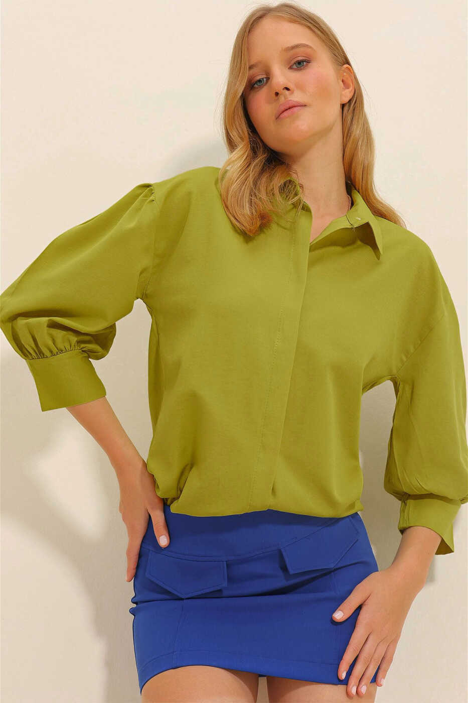 Ayollar uchun yashil rangli balon yengli yashirin tugmali oddiy poplin ko'ylak ALC-X9654 bilan zamonaviy ko'rinishga ega bo'ling va har doim qulay his eting.