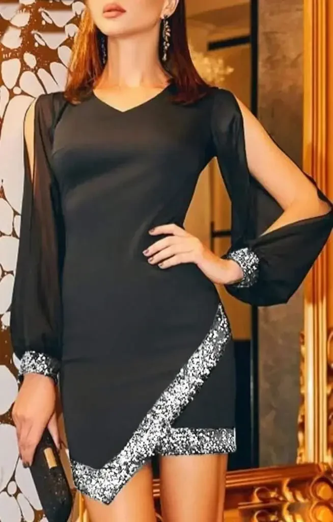 Pul Payetli Mini Ko'ylak | Ayollar V Yoqali Uzun Yengli Krep Ko'ylak