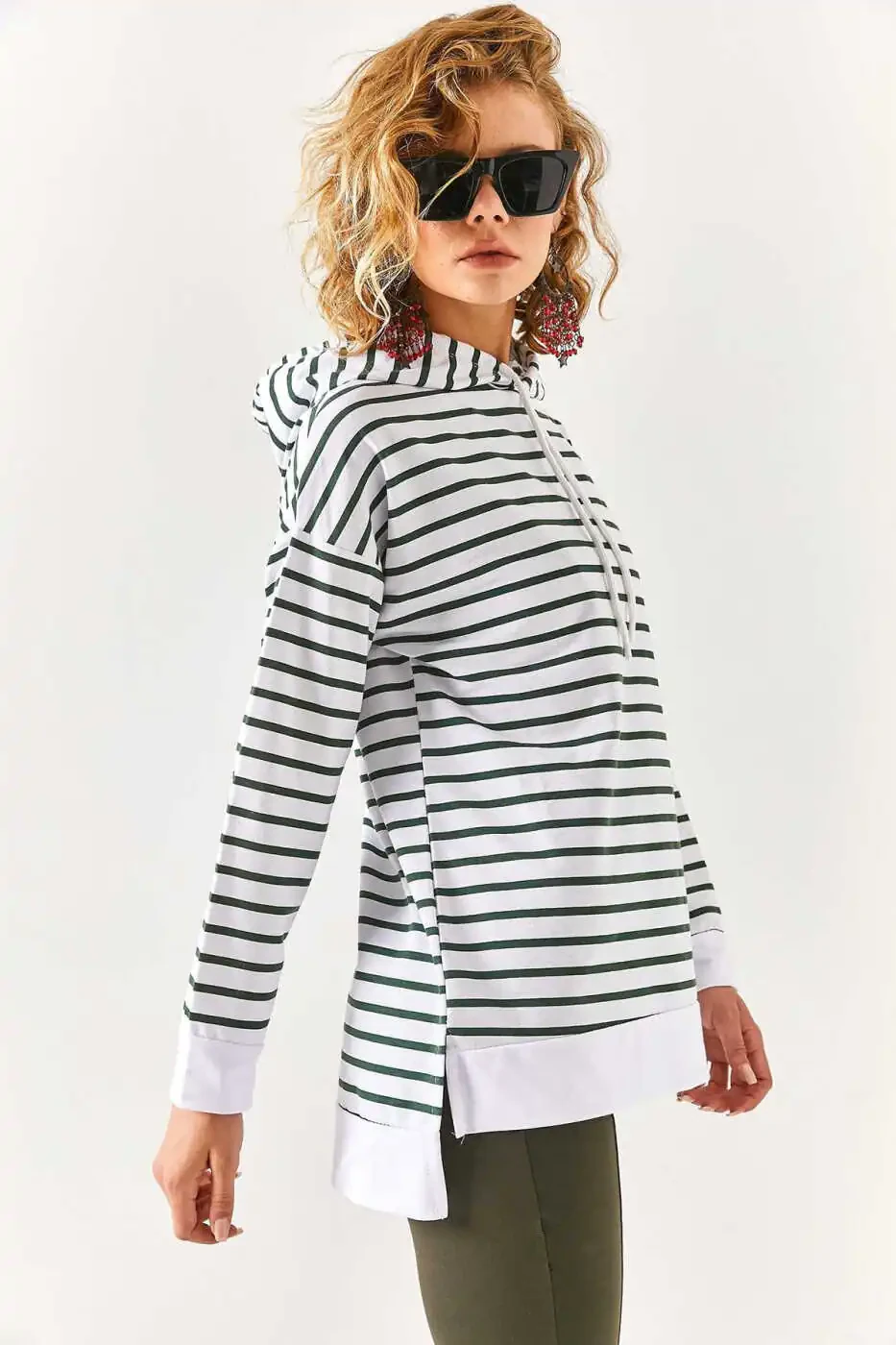 Ayollar uchun xaki oq rangli oq chiziqli yon tomoni yirtilgan kapüşonlu futbolka - SWT-19000410